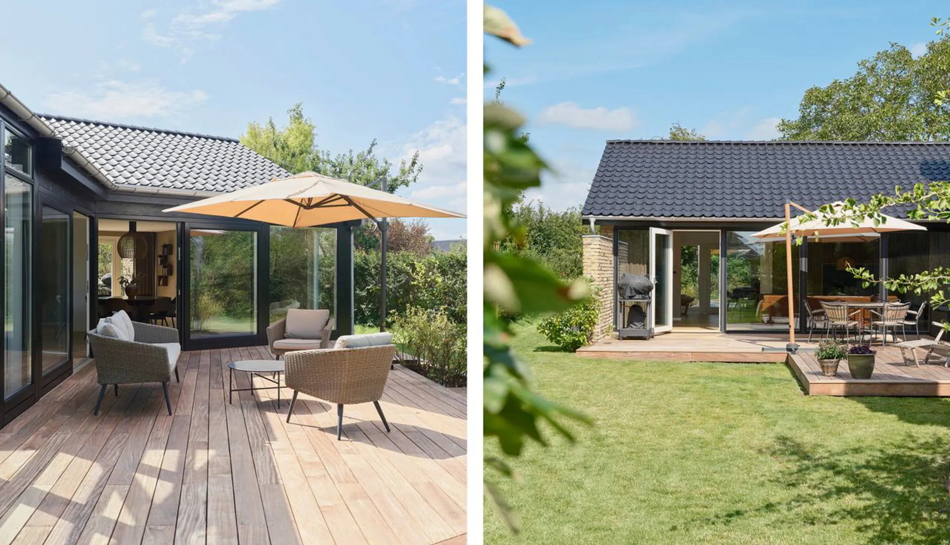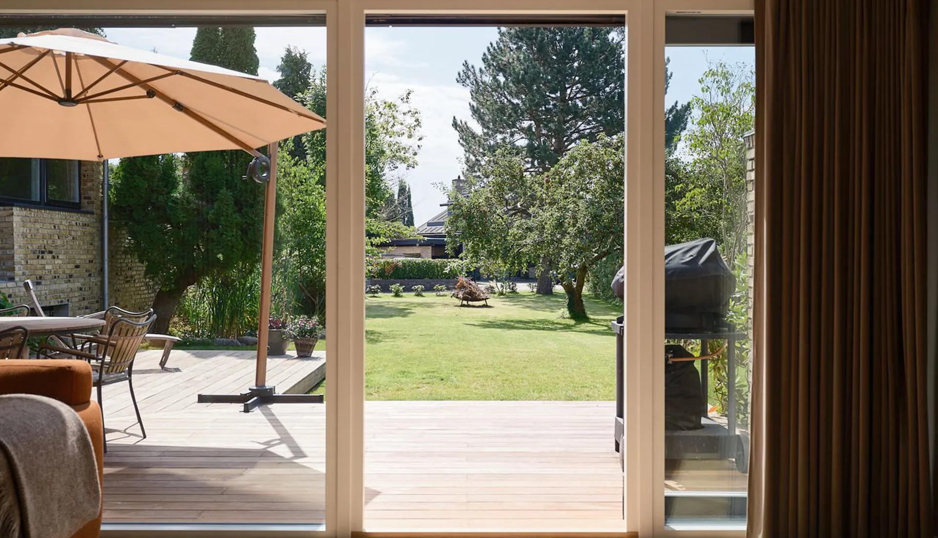 Haven er en fortælling for sig, der folder sig ud omkring huset. De gamle træer står som trofaste skygger, rhododendron og blomster bringer farverne frem, bærbuske og stengærder tegner linjerne, og i midten ligger en lille dam med åkander. To store terrasser i eksotisk hårdttræ fanger solen fra morgen til aften og indbyder til både stille kaffestunder og lange aftener med ild i bålet.