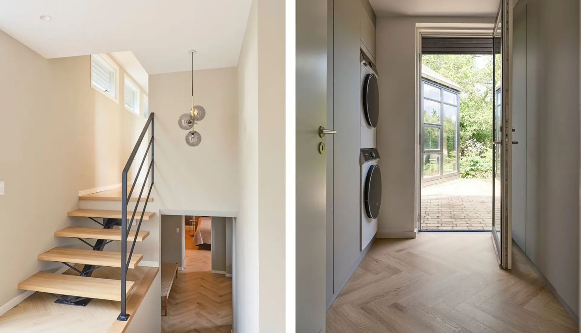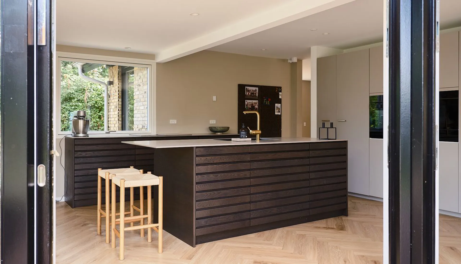 To store opholdsrum danner hjertet – tæt forbundet, men med mulighed for at være hver for sig. Køkkenet åbner sig mod et lyst køkkenalrum, hvor et stort glasparti kan foldes til side, så sommerens dufte og lyde glider lige ind. Stuen ligger på den anden side – tæt nok til, at snakken kan fortsætte, men med mulighed for ro, når det er dét, man trænger til.