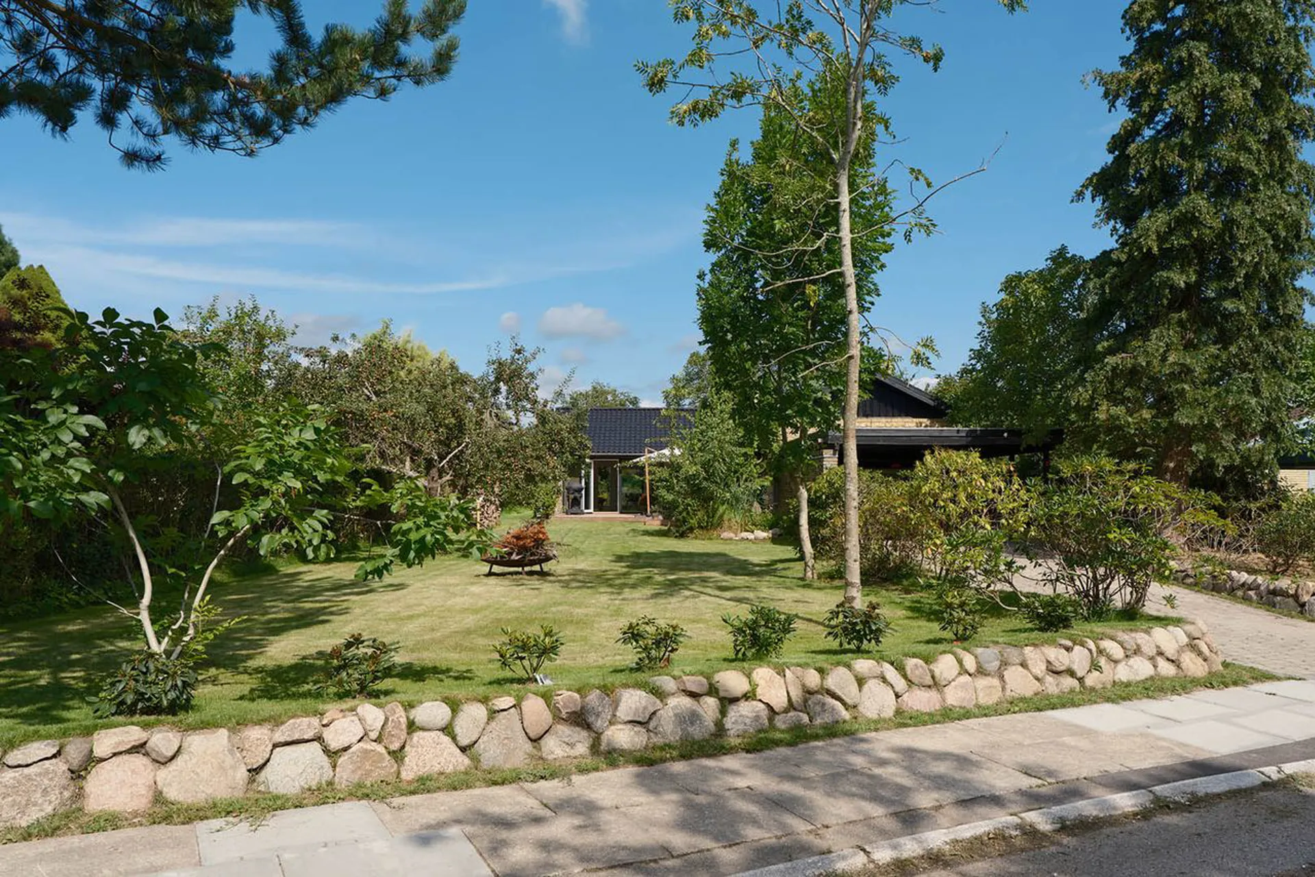 Haven er en fortælling for sig, der folder sig ud omkring huset. De gamle træer står som trofaste skygger, rhododendron og blomster bringer farverne frem, bærbuske og stengærder tegner linjerne, og i midten ligger en lille dam med åkander. To store terrasser i eksotisk hårdttræ fanger solen fra morgen til aften og indbyder til både stille kaffestunder og lange aftener med ild i bålet.