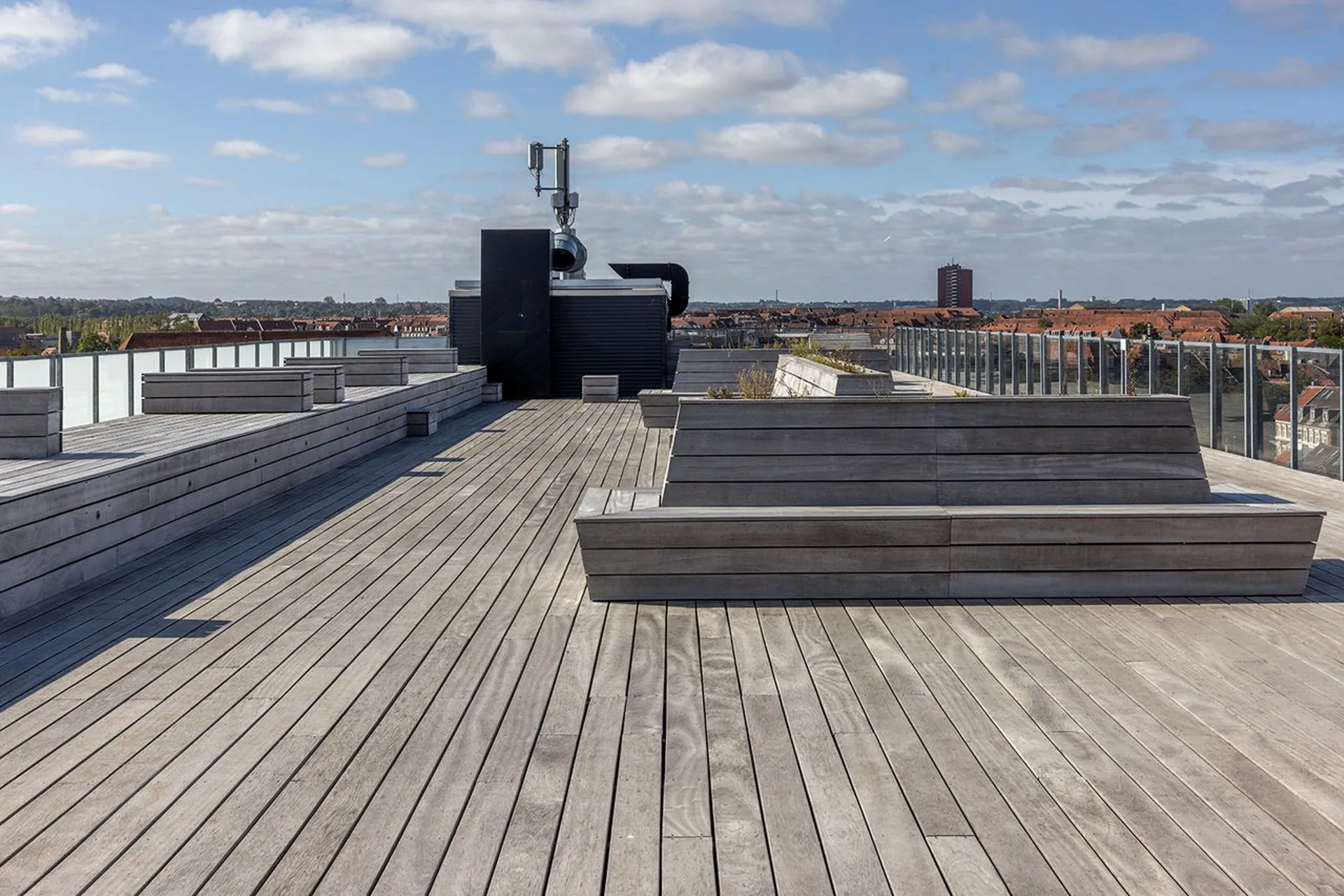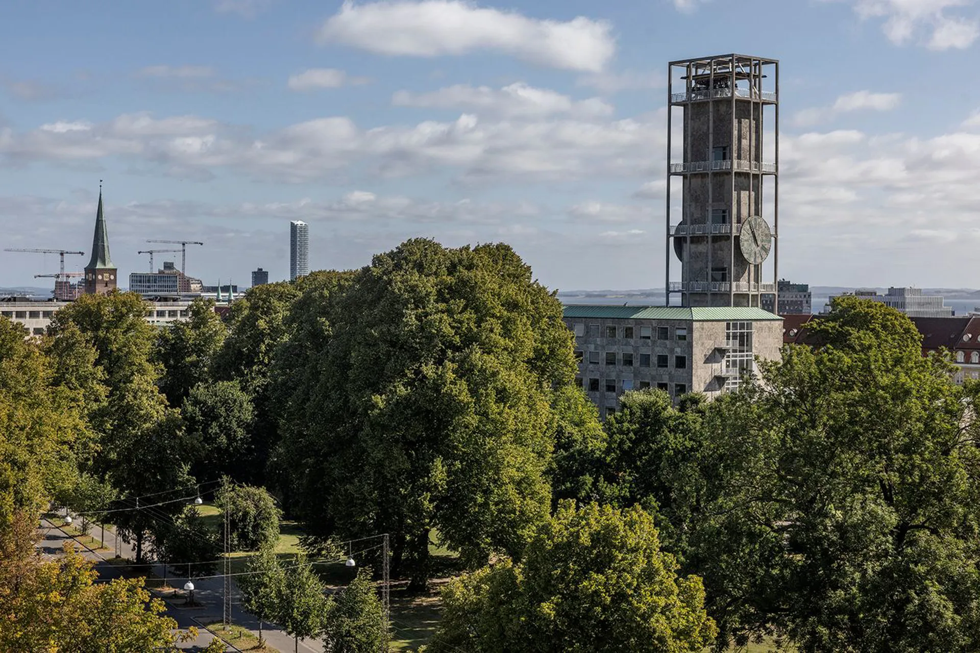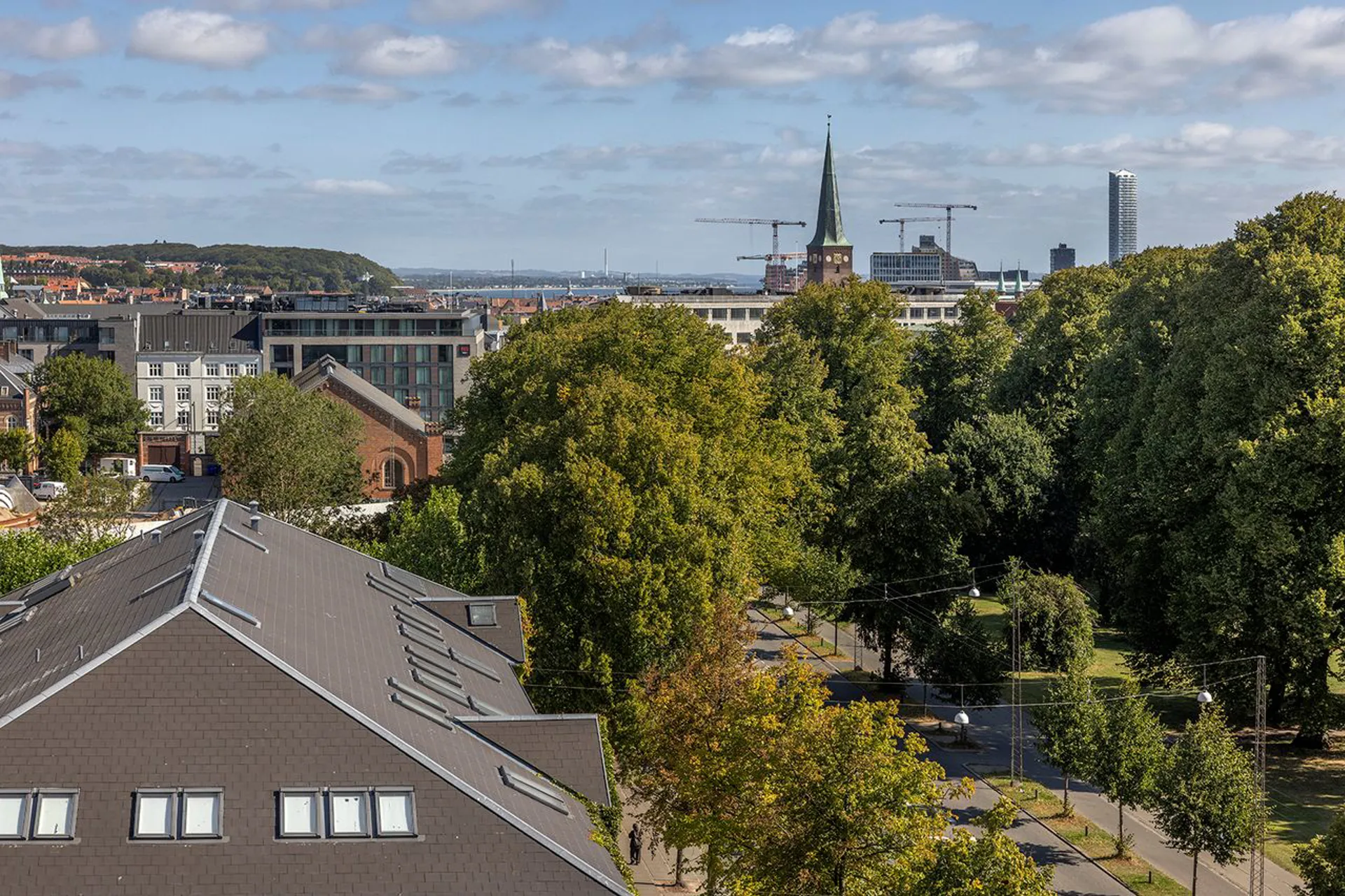 Ejendommens fælles tagterrasse åbner sig mod himlen – et uderum højt hævet over byen. Herfra ser man direkte til ARoS med regnbuen svævende over byens tage, og længere ude anes havnen, kranerne og byens industrielle silhuet i det fjerne. En udsigt fuld af lag og fortællinger – hvor byens kultur og kontraster mødes i ét levende panorama, og som ændrer sig i takt med lyset og årstiderne.
