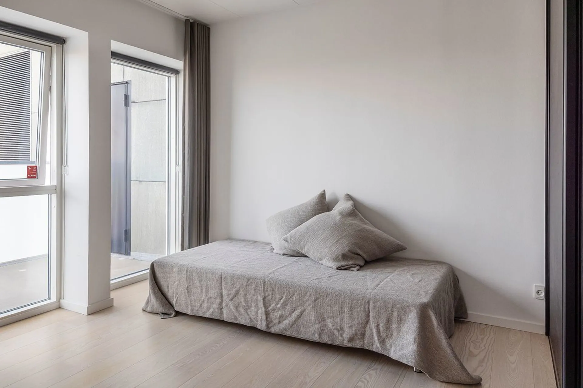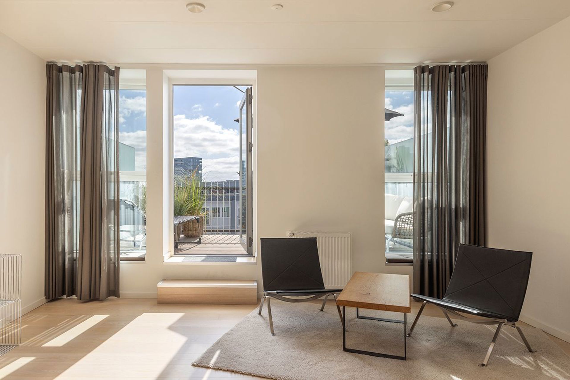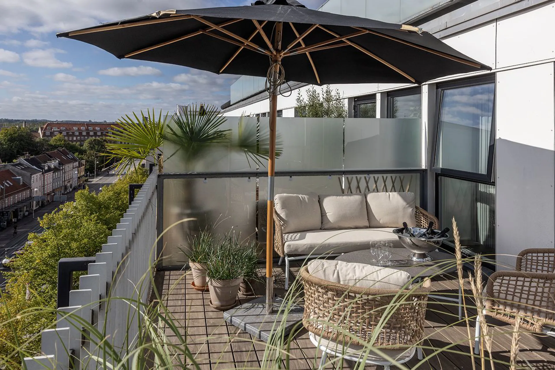 Lejligheden har udgang til en stor altan fra alrummet, hvor byen folder sig ud, og hvor morgensolen kaster sine første stråler ind over gulvet. Heroppefra breder udsigten sig over kvarteret: en harmonisk blanding af det gamle og det nye. Historiske facader møder moderne silhuetter, og kontrasterne skaber netop den stemning, der kendetegner det levende Aarhus.