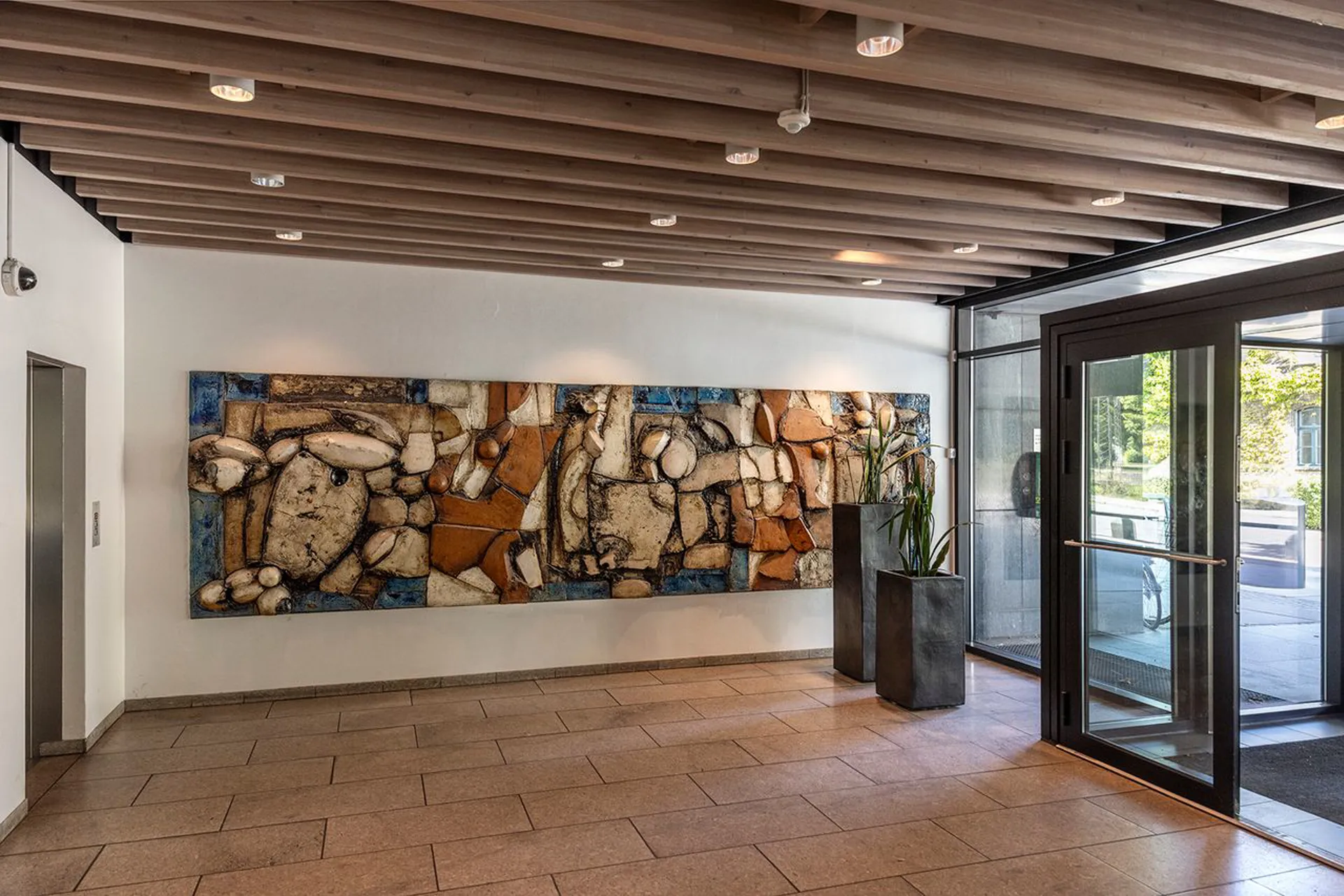Ejendommens fælles tagterrasse åbner sig mod himlen – et uderum højt hævet over byen. Herfra ser man direkte til ARoS med regnbuen svævende over byens tage, og længere ude anes havnen, kranerne og byens industrielle silhuet i det fjerne. En udsigt fuld af lag og fortællinger – hvor byens kultur og kontraster mødes i ét levende panorama, og som ændrer sig i takt med lyset og årstiderne.