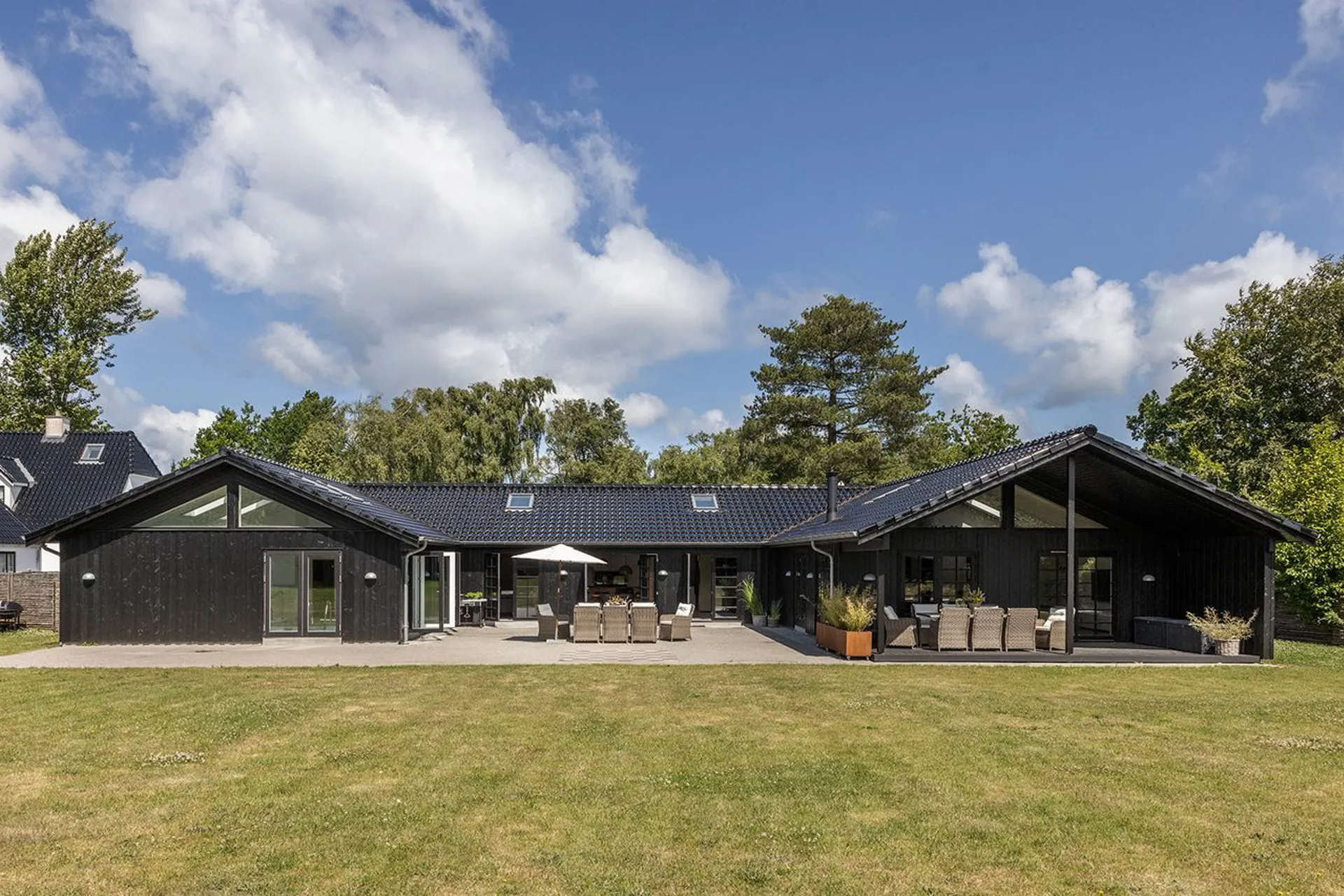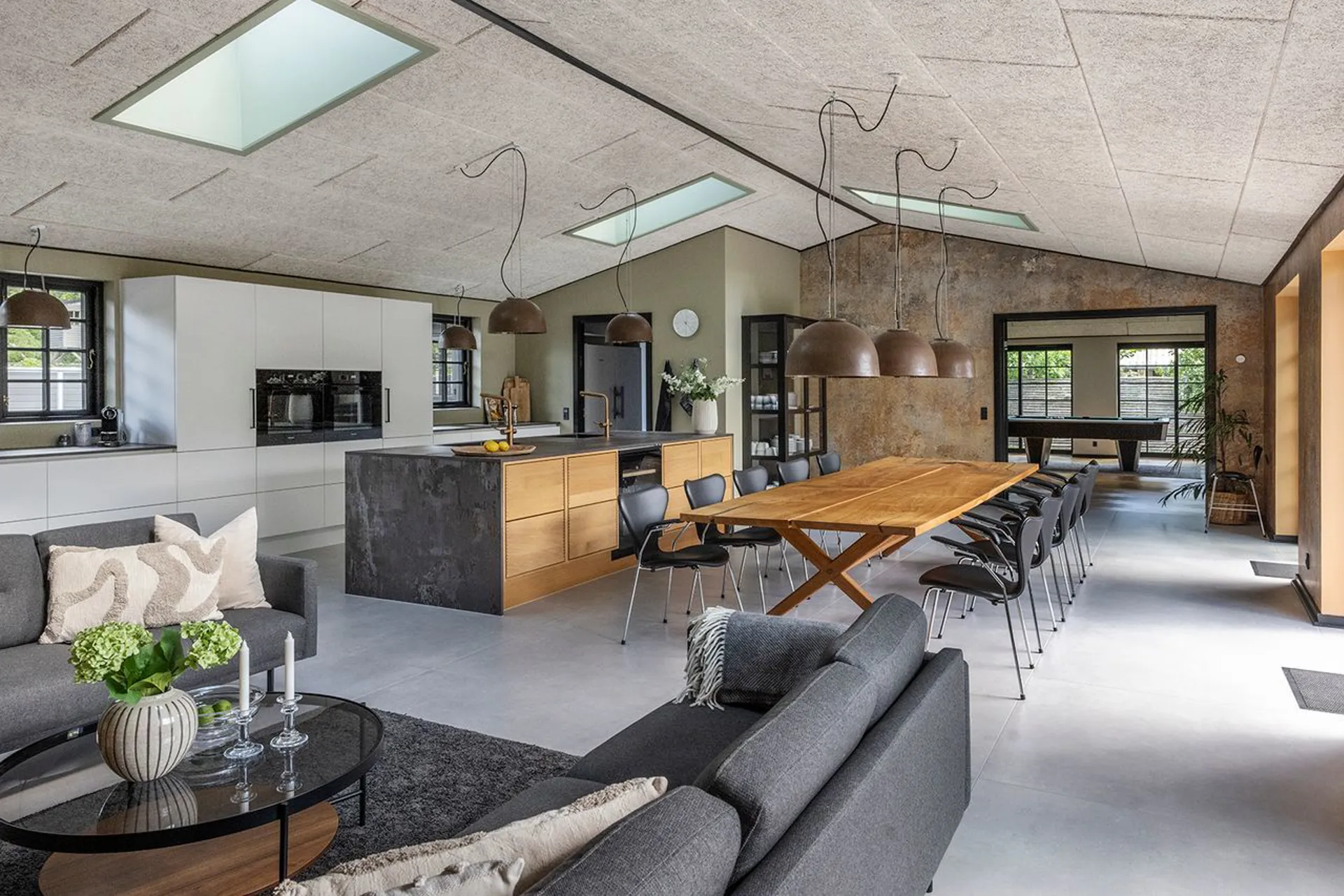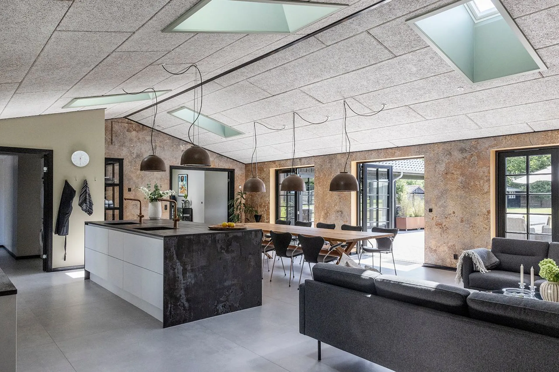 Det store køkken-alrum samler årstider og mennesker, og glider ud i stuen og videre ud til den overdækkede terrasse – hvor aftenerne kan trækkes ud, længe efter solen er gået ned.