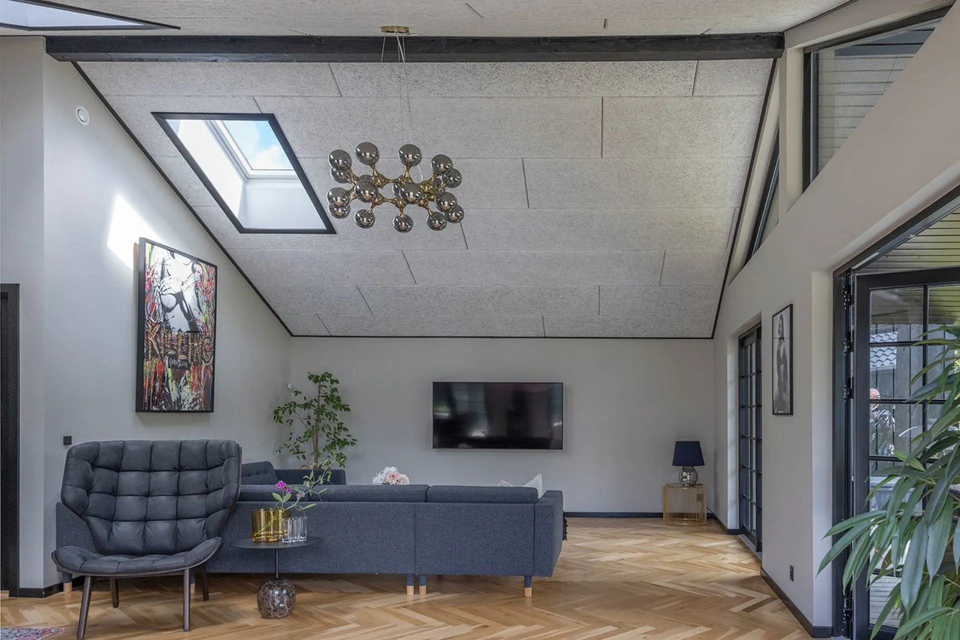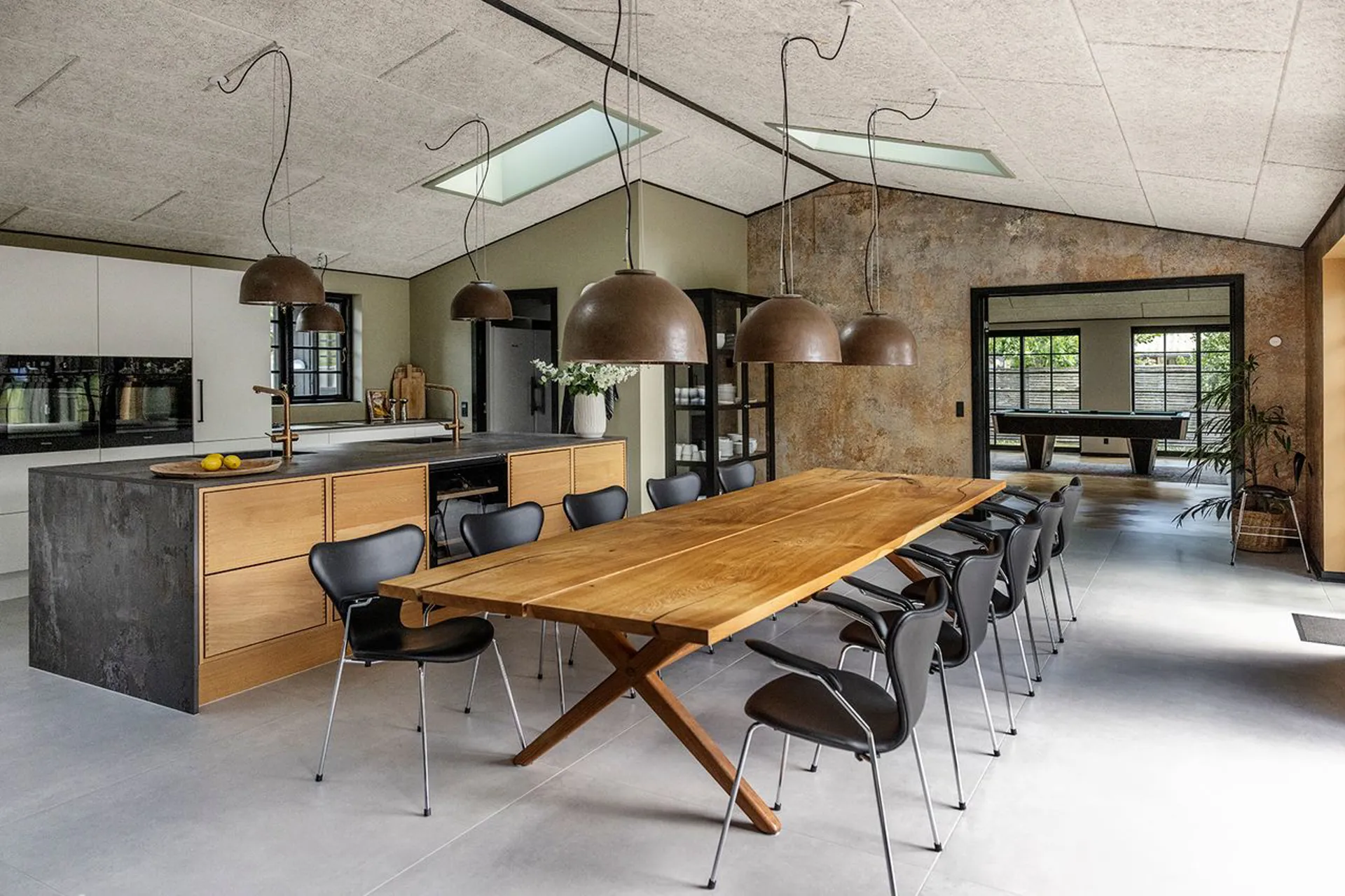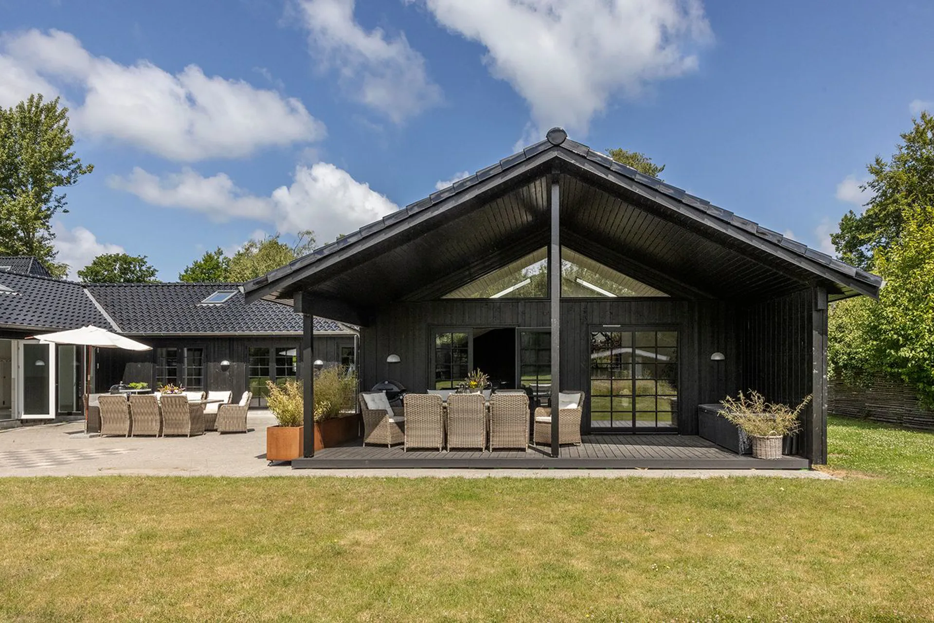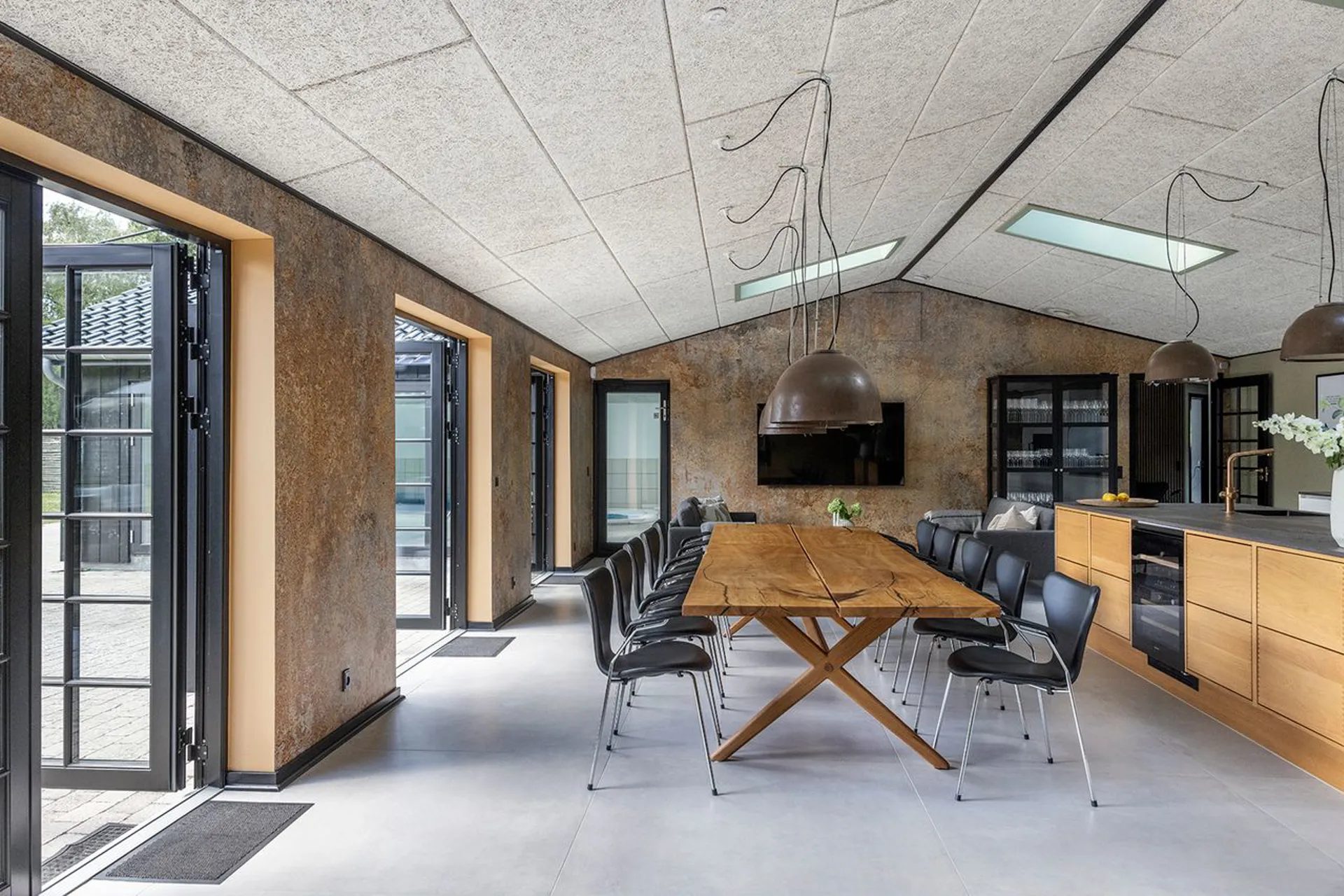 Det store køkken-alrum samler årstider og mennesker, og glider ud i stuen og videre ud til den overdækkede terrasse – hvor aftenerne kan trækkes ud, længe efter solen er gået ned.