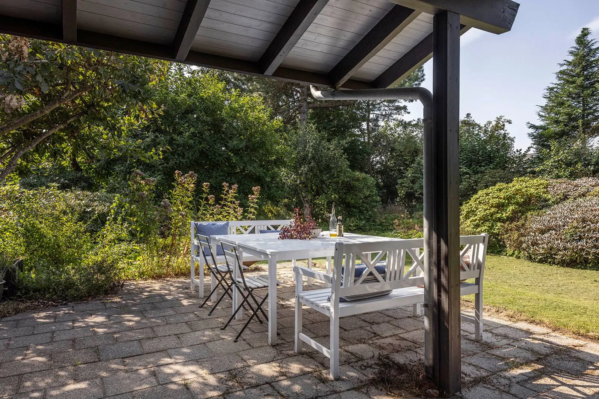 Bygningen fordeler 97 m² indvendig bebyggelse (BBR: 70m²) i stort alrum med funktionelt indrettet køkken, spisestue og opholdsstue med brændeovn og yderligere tre skønne soveværelser og et veldisponeret badeværelse. Omkring huset er der i læ af et stort vinduesparti etableret et meget indbydende overdækket miljø med indbygget sofa-bænk-mulig-soveplads-til en lun-sommeraften og muret pejs – et uderum der i sin helhed virker som en flydende overgang mellem husets indvendige rum og de udeliggende haverum.