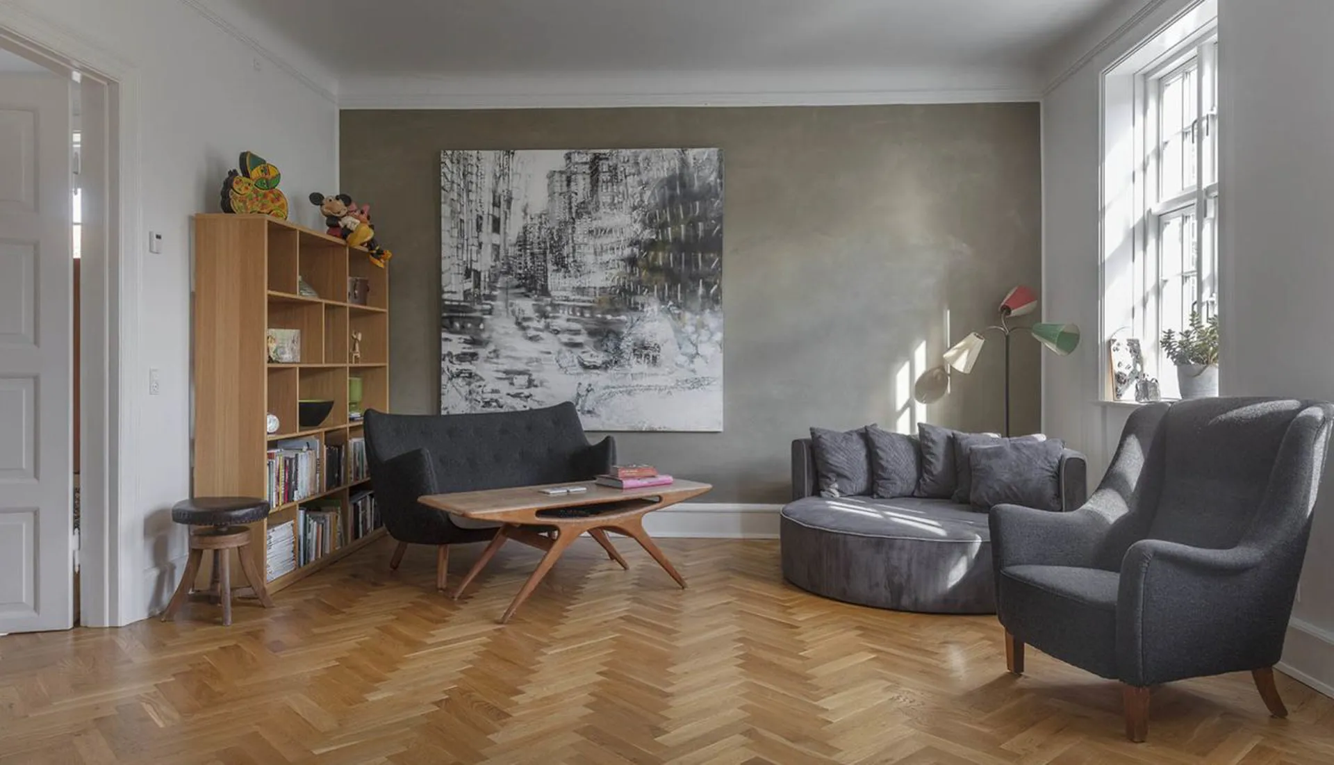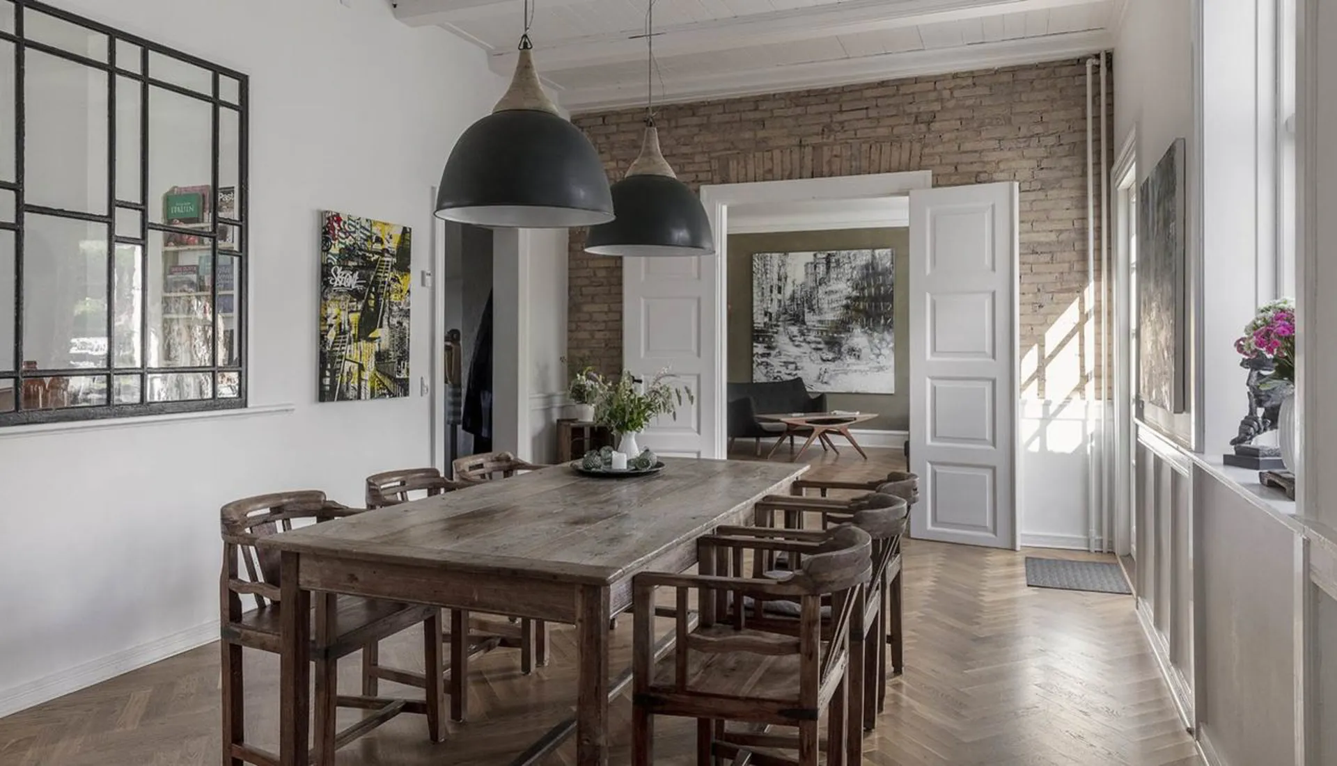 Boligen er indrettet med entré til smukt trappeløb, hvorfra der er adgang til én af de tre højloftede stuer, hvor spisestuen ligger i åben forbindelse med stort smagfuldt indrettet køkkenalrum med sideliggende viktualierum. Fra spisestuen er der udgang til stort sydvendt terrasseområde, der virker som en flydende overgang til det smukt anlagte haverum. 1, salen er indrettet med fire skønne soveværelser, depotrum og smagfuldt badeværelse med kar. Dertil særdeles veldisponeret underetage med vaskefaciliteter, bryggers og gode opbevaringsmuligheder.