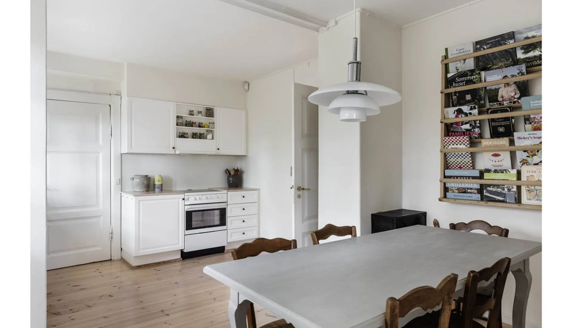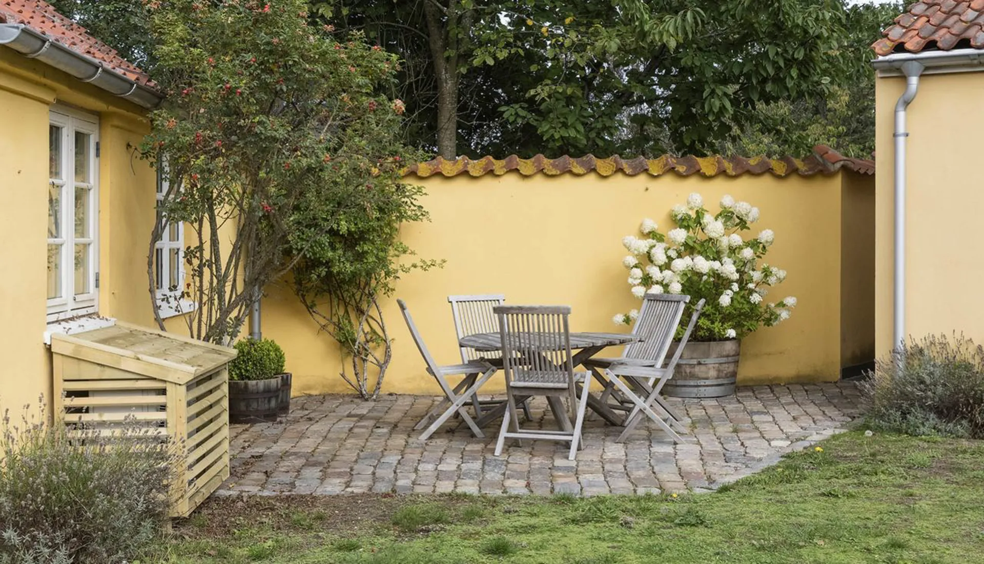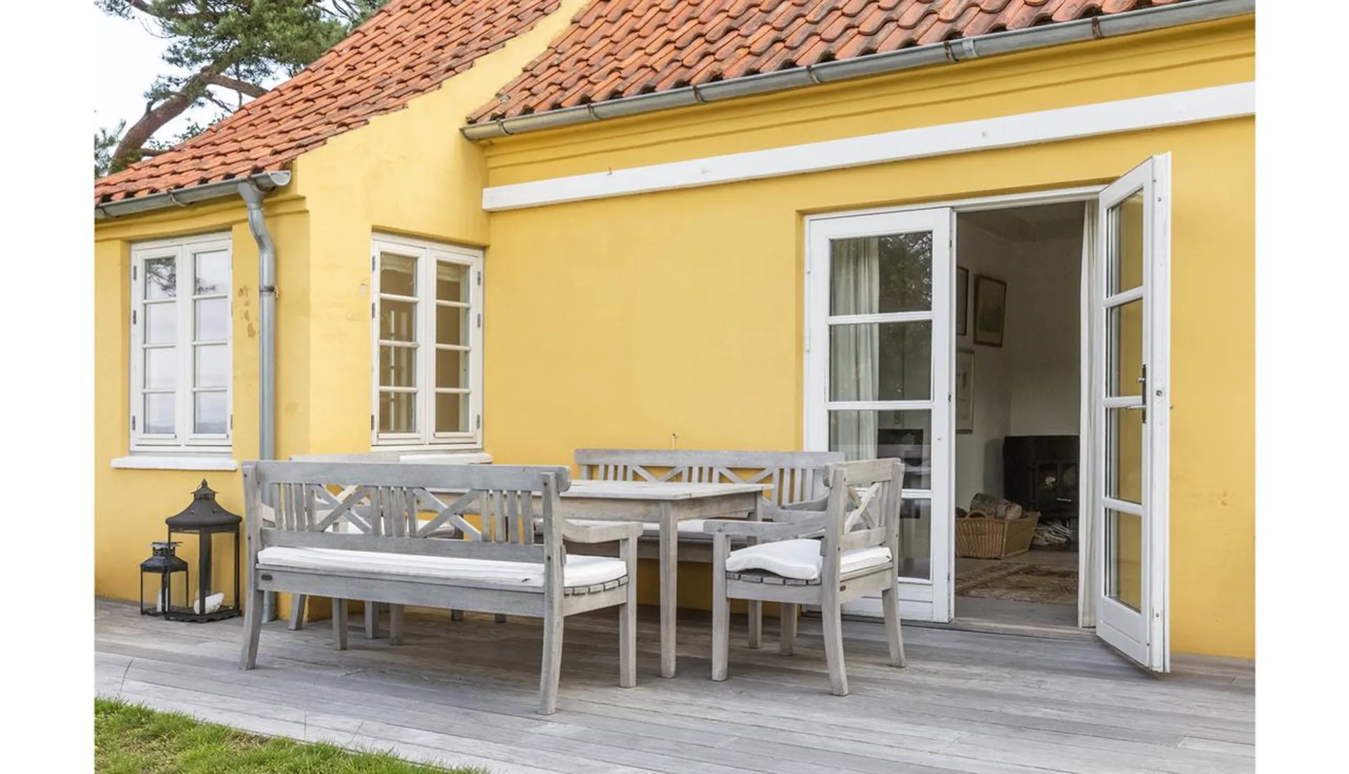 Indretning: Entré til stor opholdsstue/spisestue med brændeovn i åben forbindelse med mindre hjørnestue og udgang til det skønneste solbeskinnet terrasseområde. Fra spisestuen er der adgang til charmerende og funktionelt indrettet køkken med viktualierum og spiseplads. Lækkert indrettet badeværelse med kar og brus. Desuden veldisponeret mindre kælder. 1. salen er indrettet med fire hyggelige soveværelser – hvert rum med sine fine detaljer.