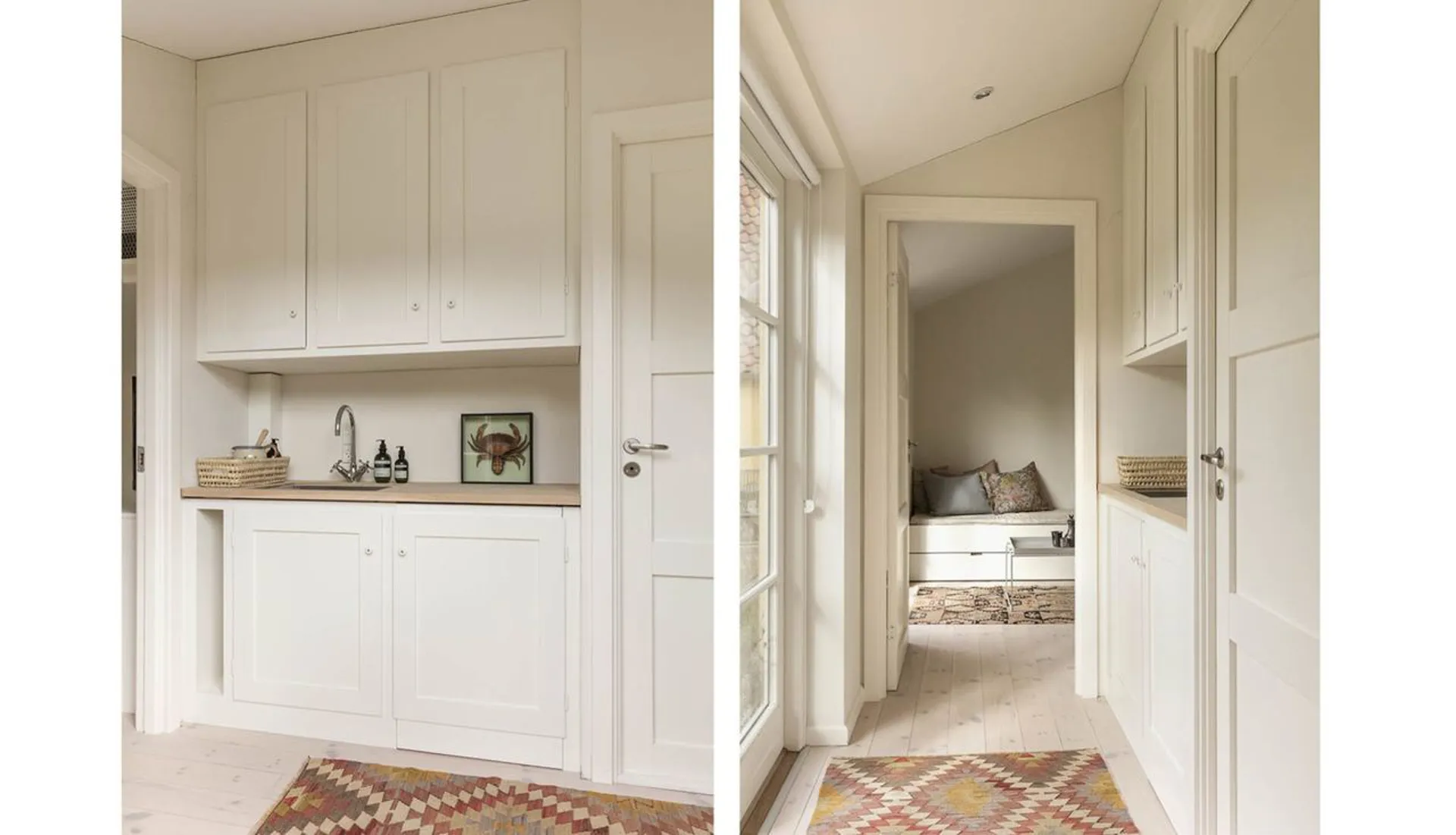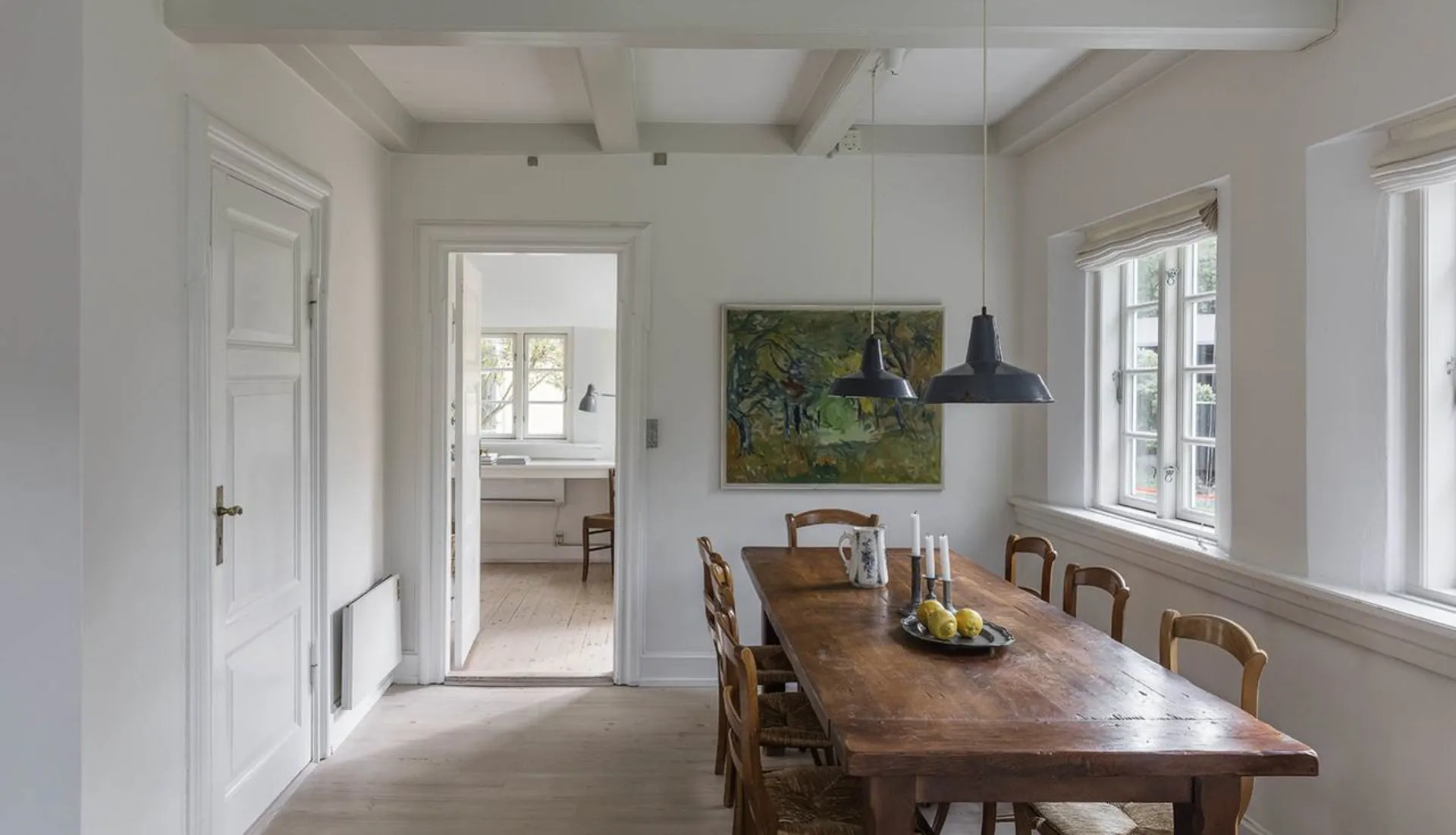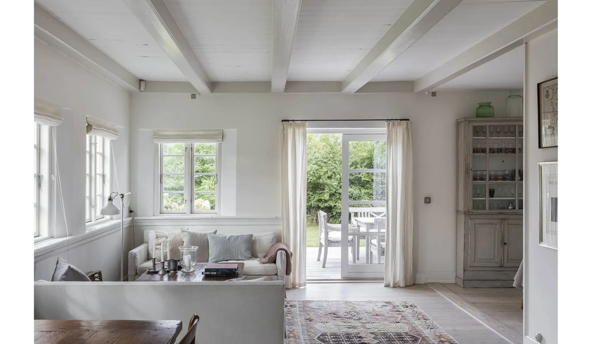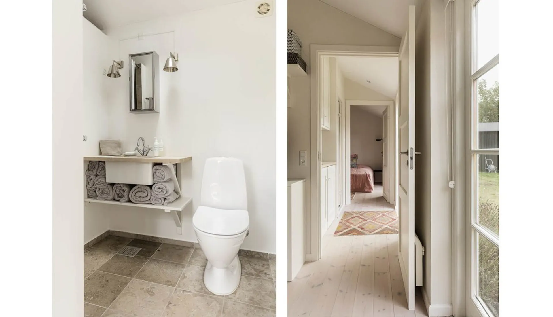 Indretning: Entré til stor opholdsstue/spisestue med brændeovn i åben forbindelse med mindre hjørnestue og udgang til det skønneste solbeskinnet terrasseområde. Fra spisestuen er der adgang til charmerende og funktionelt indrettet køkken med viktualierum og spiseplads. Lækkert indrettet badeværelse med kar og brus. Desuden veldisponeret mindre kælder. 1. salen er indrettet med fire hyggelige soveværelser – hvert rum med sine fine detaljer.