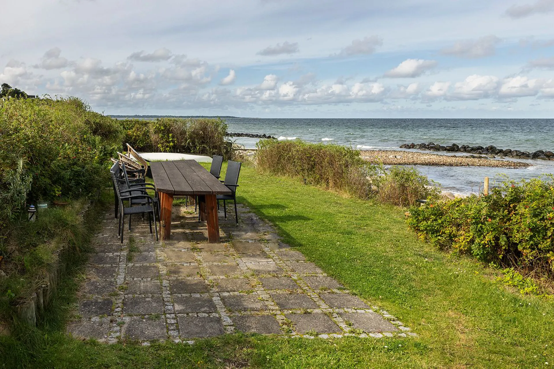 Det enestående Strandbo. Suverænt beliggende sommerhus i første række til Kattegat – en af Kikhavns vidunderlige perler. Denne idylliske kystby er kendt for sine strande, sin dramatiske kystlinje og et enestående sommerhusliv, der strækker sig langt ud over det sædvanlige. I de senere år er området blevet forvandlet til en oase, hvor den nærliggende Hundested Havn tiltrækker gourmeter og livsnydere, der drages af havnens charmerende miljø. Strandbo, hedder huset, opført i 1938, står som en stolt repræsentant for Kikhavns historiske kysthuse. Med sin autentiske arkitektur fanger Strandbo essensen af det gamle Kikhavn, hvor tidens tand har forfinet dens bondeidyl. Her mødes det private og det åbne i en perfekt symfoni, hvor havet, huset og haven smelter ligesom sammen i en harmonisk enhed. Strandbo syntes at stå som et vartegn for området.