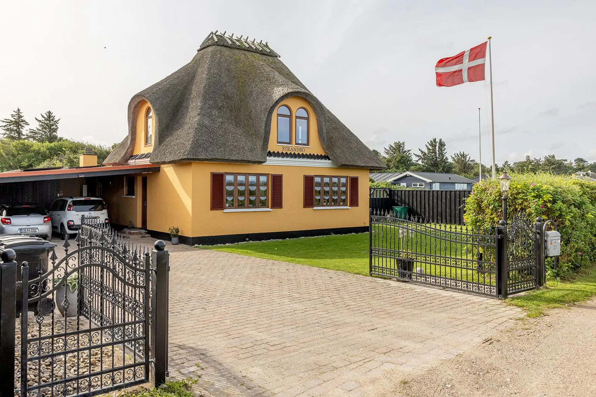 Indenfor byder boligen på en varm atmosfære. Entréen fører til et af husets badeværelser, et bryggers og et charmerende køkken-alrum som står velholdt fra tilbygningens tid med direkte udgang til den store terrasse, hvor solen danser hele dagen. I stueetage findes også husets andet badeværelse, på husets 1. etage findes to soveværelser, hvor man vågner til udsigten og lyden af havets beroligende bølgeskvulp. Ved siden af huset er der anlagt en stor carport med et indbygget skur. Historien siger, at Hendes Majestæt Dronning Margrethe II har vandret den smukke natursti fra Hundested Havn til Kikhavn, gennem den bølgende Bøgeskov og videre langs Halsnæsstien, der lægger sig igennem Strandbos private grund. Dronningen skulle angiveligt have standset op for at beundre det udsøgte ydre, som denne ejendom så stolt fremviser. Strandbo er i sandhed et enestående sommerhus, med en enestående beliggenhed, formgivet af en enestående arkitektur, der elegant fremhæver noget af det mest enestående af vores smukke lands smukke kystlinje.