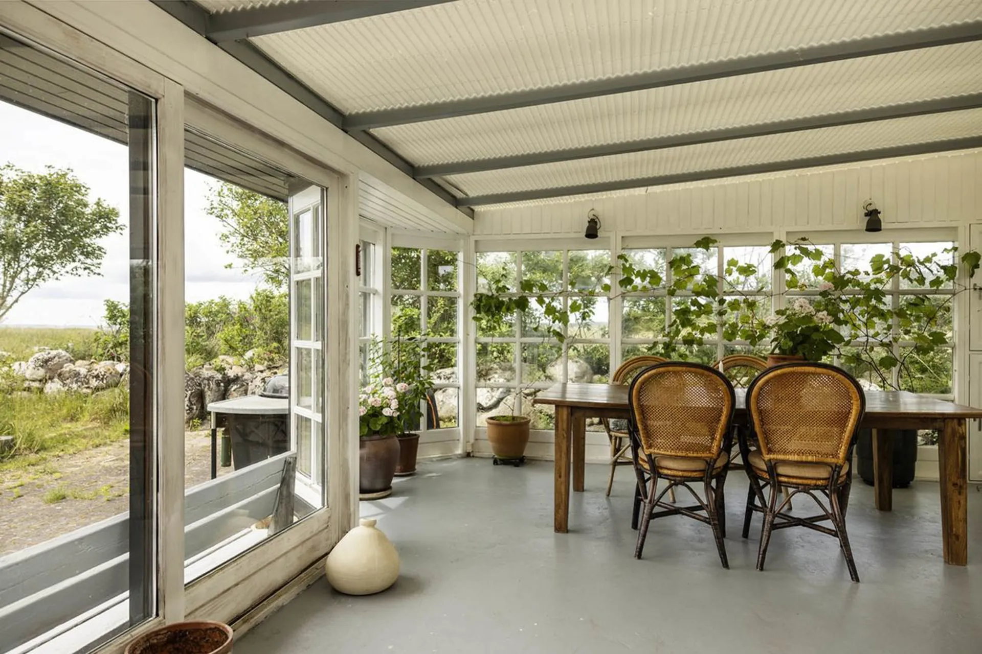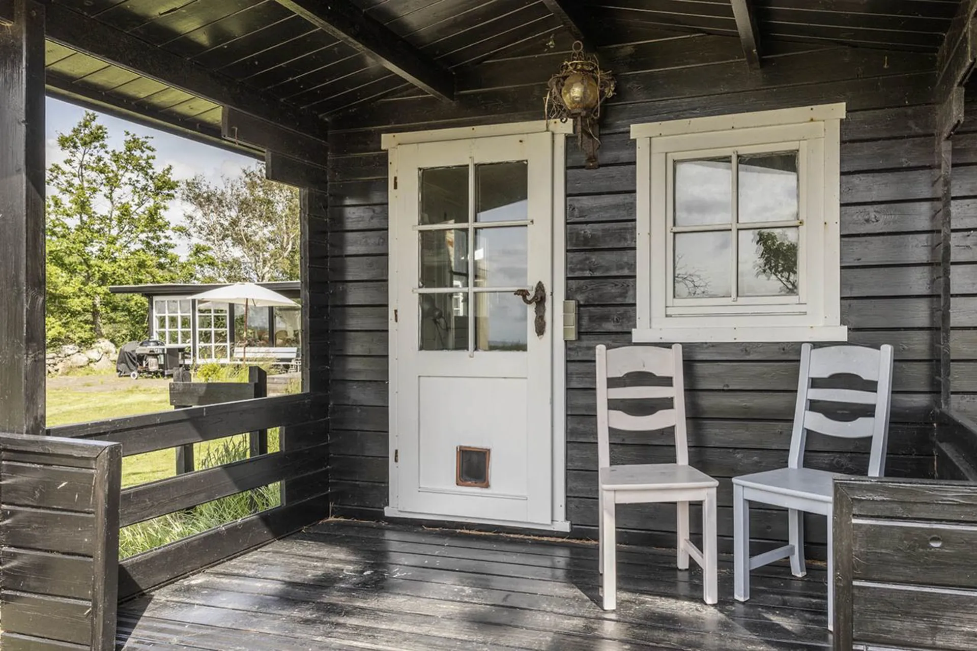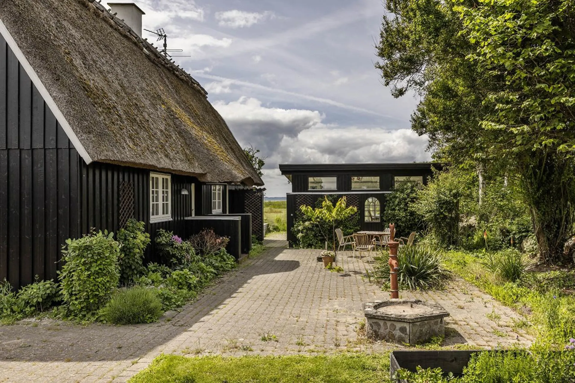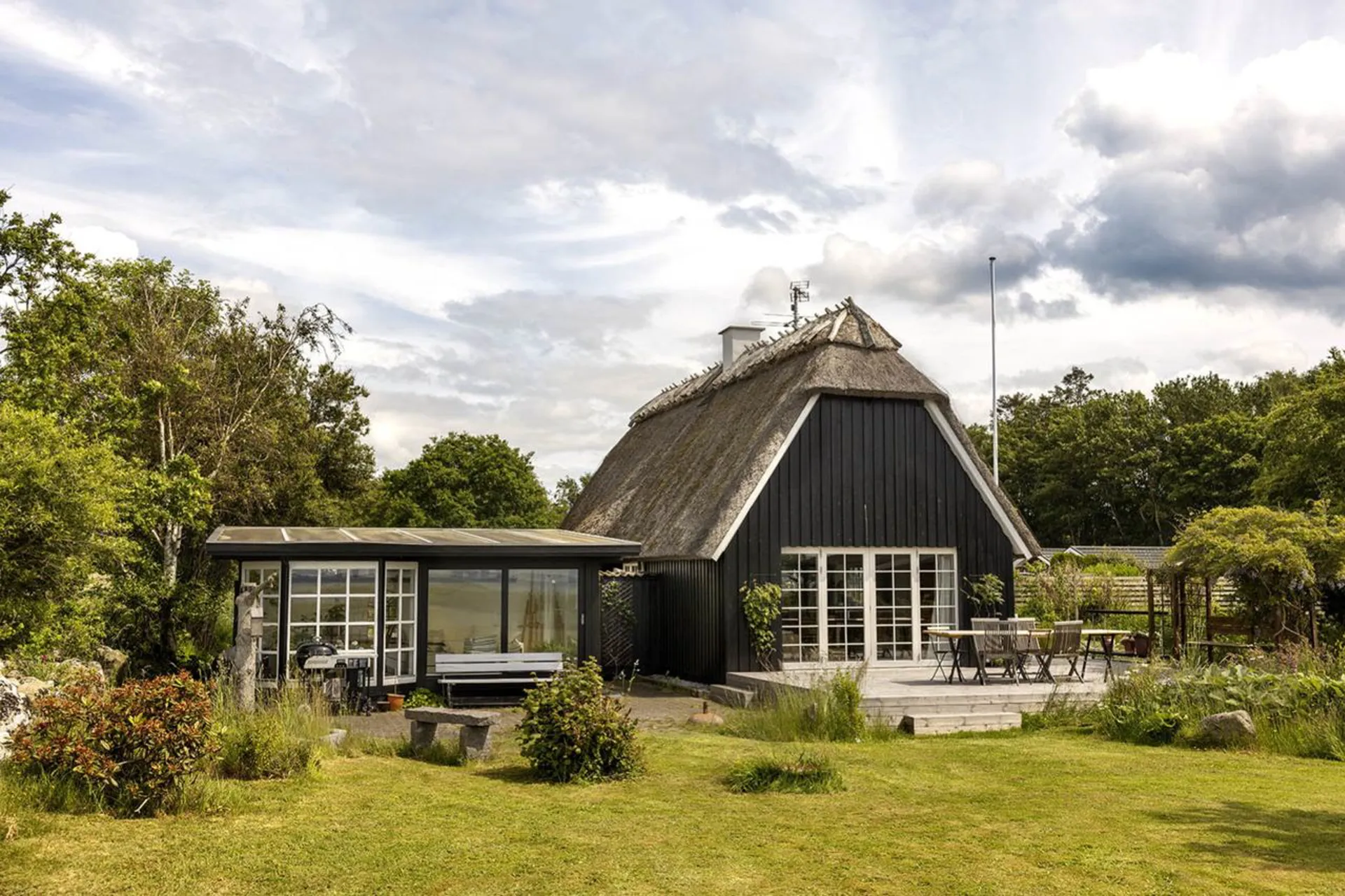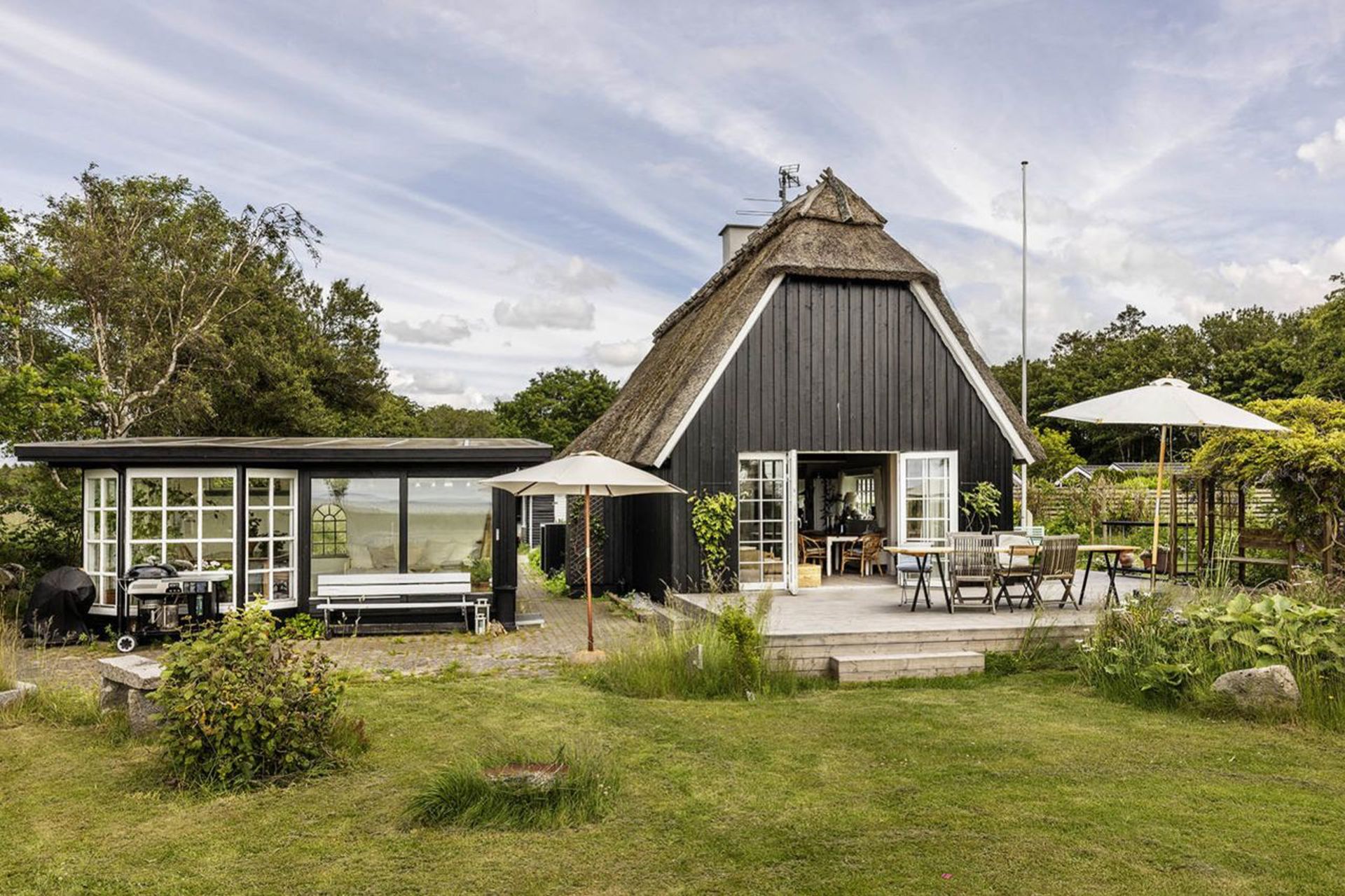 Sideliggende bygning der er indrettet som vinterhave med terrasseområde orienteret mod haven, anneks med to sovepladser og brændeovn og garagebygning med god plads til opbevaring.