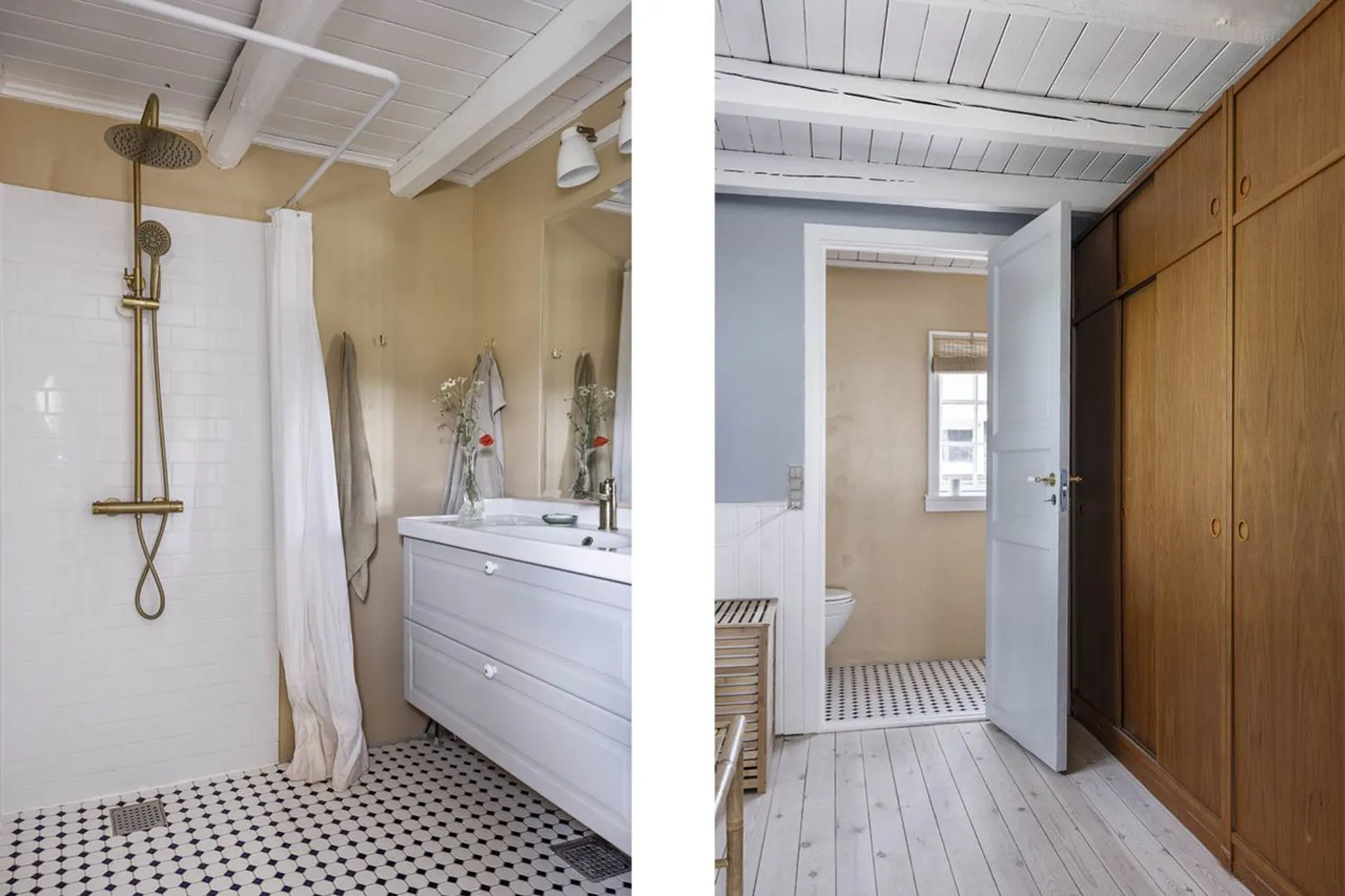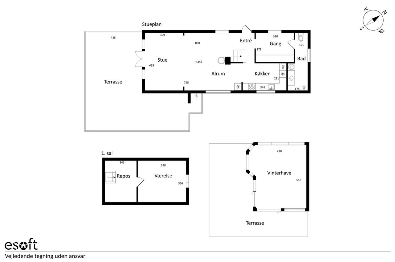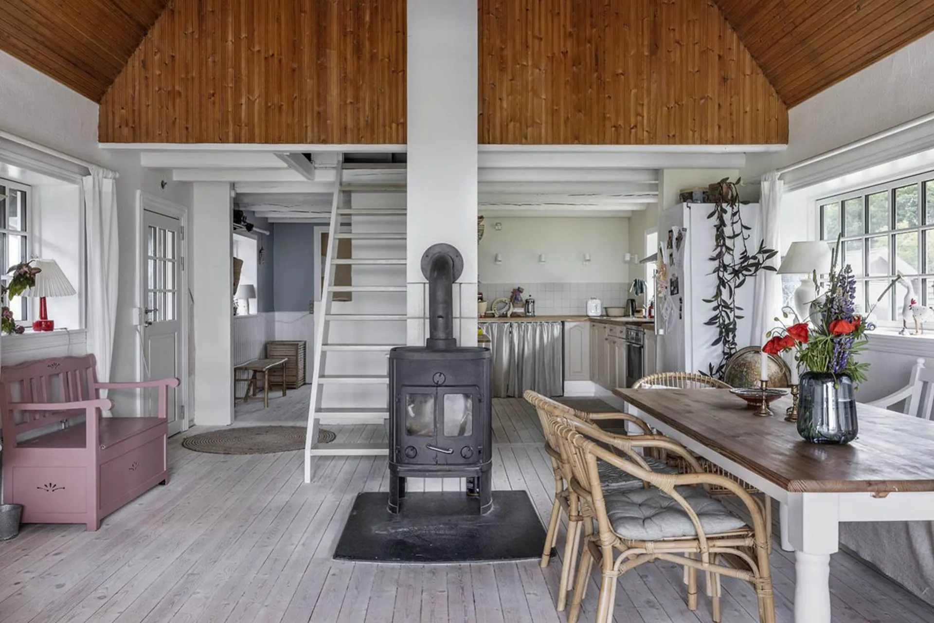 Husets 69 m2 (BBR) er indrettet med entré til alrum med funktionelt og charmerende køkken, spisestue med brændeovn og opholdsstue, hvorfra der er udgang til stor syd-øst-vest vendt terrasseområde. Desuden skabsgang til badeværelse med brus. 1. salen er indrettet med repos til et hyggeligt disponibelt rum og der oplagte muligheder for at etablere en hems over alrummet, som kan give plads til yderligere disponibel plads i huset.