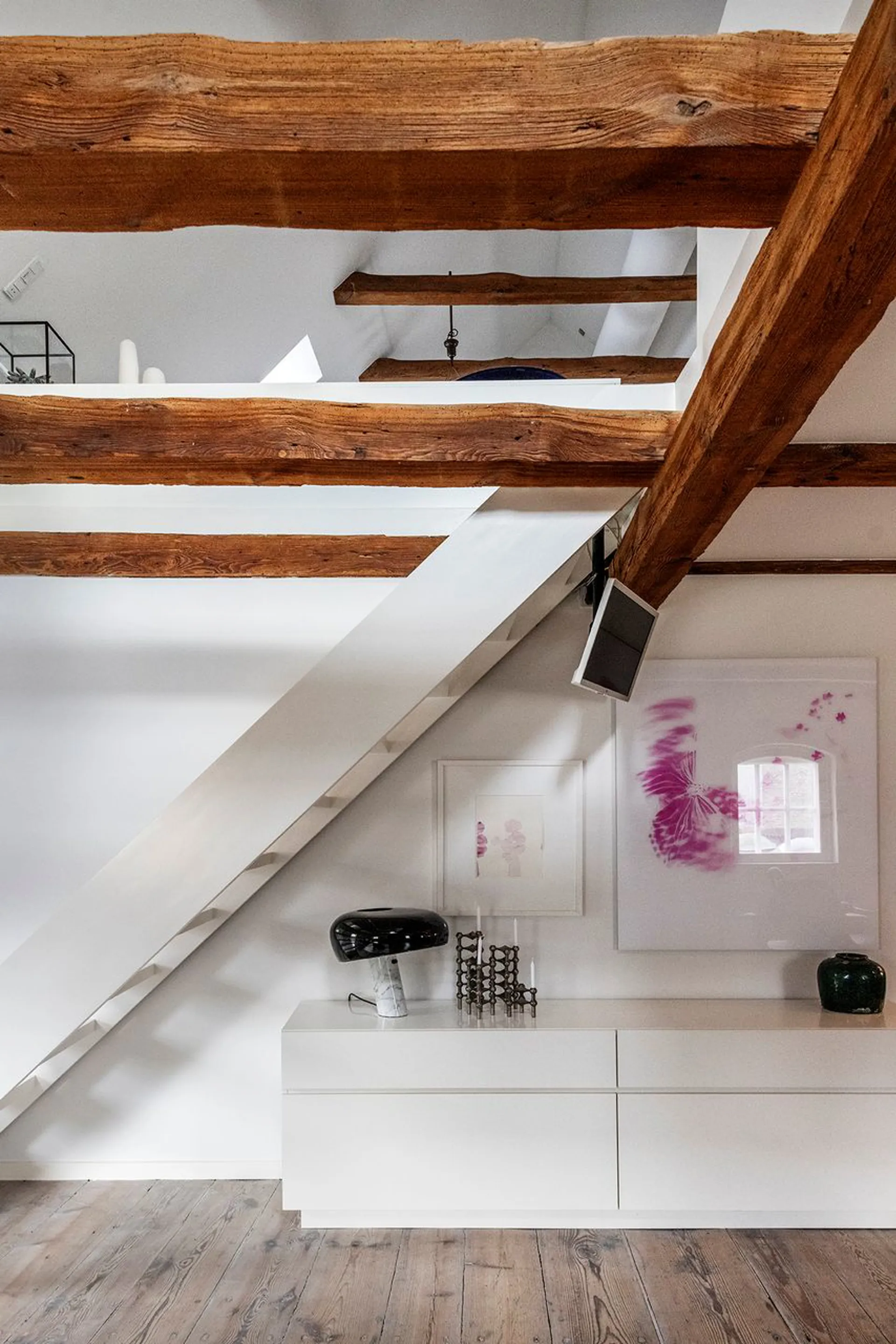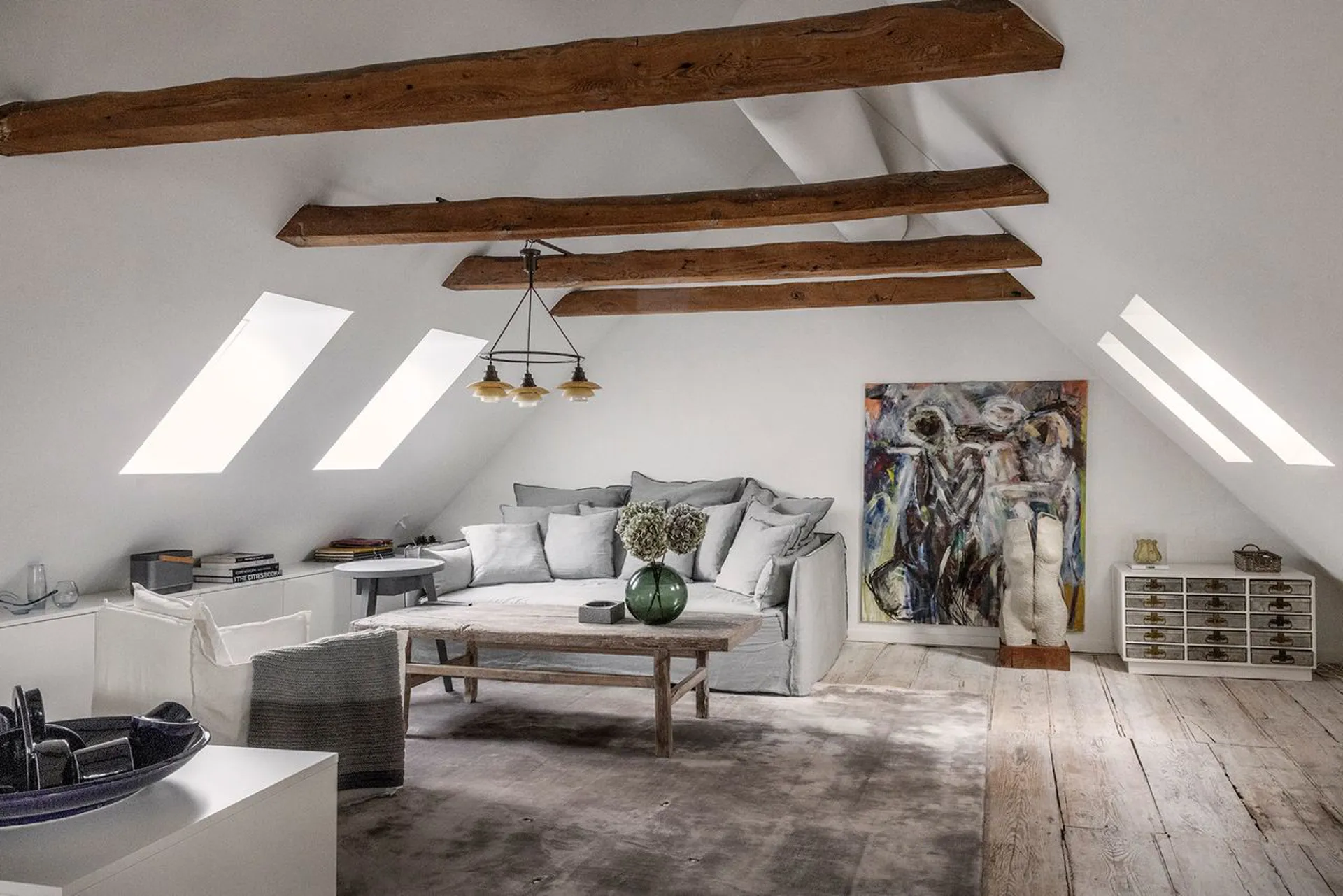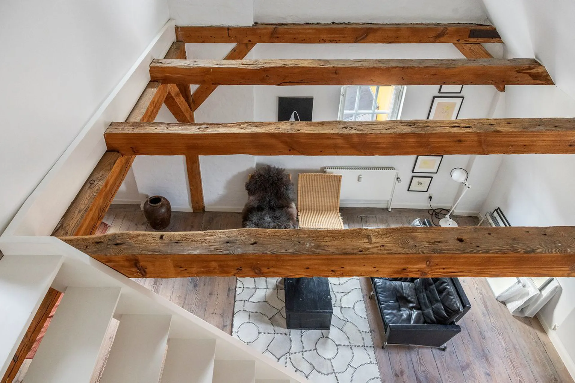 Lejligheden fordeler entré, hvorfra der er adgang til stort soveværelse, smagfuldt badeværelse med brus og grundplanets store alrum med funktionelt indrettet køkken, spiseafdeling og opholdsstue. Herfra trappeløb til lejlighedens øvre niveau, der i dag er indrettet som stor opholdsstue på mere end 40 m² med loft til kip – et fantastisk rum, som omfavner en med nærhed og hjertelighed.
