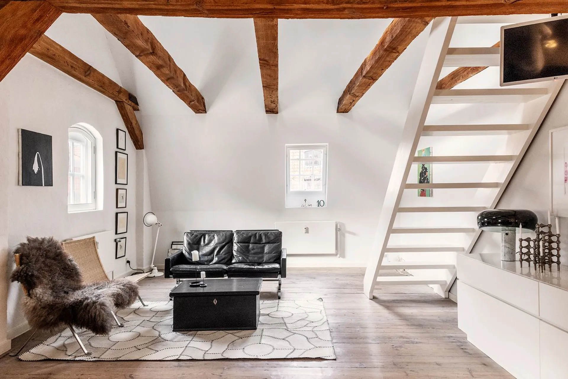 Lejligheden fordeler entré, hvorfra der er adgang til stort soveværelse, smagfuldt badeværelse med brus og grundplanets store alrum med funktionelt indrettet køkken, spiseafdeling og opholdsstue. Herfra trappeløb til lejlighedens øvre niveau, der i dag er indrettet som stor opholdsstue på mere end 40 m² med loft til kip – et fantastisk rum, som omfavner en med nærhed og hjertelighed.