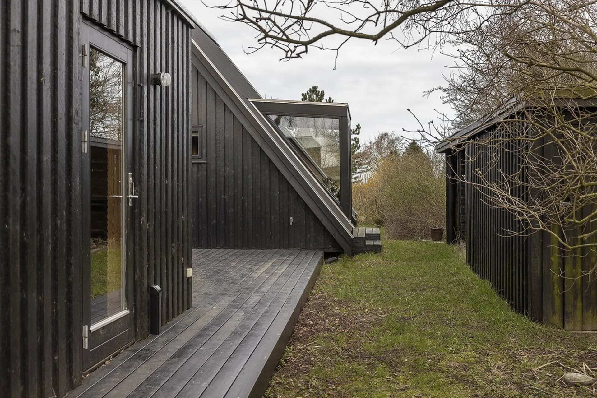 Indretning: Entré, hvorfra der er adgang til både badeværelse med brus, soveværelse med skabsvæg og husets store alrum, der fordeler køkken, spiseplads og opholdsstue i ét åbent højloftet rum til kip. Over badeværelse og soveværelse er der en hyggelig hems, med et enestående kig til ned over Bakkerne med vandet lige dér ude bagved. Annekset er indrettet med dobbeltseng og kontorplads. Fra alrummet er der udgang til stort terrasseområde med sol, horisont og udsigt til vandet – og mellem hovedhus og anneks endnu et terrassedæk, der både giver en skøn ankomst til huset, og en fin forbindelse mellem de to bygninger.