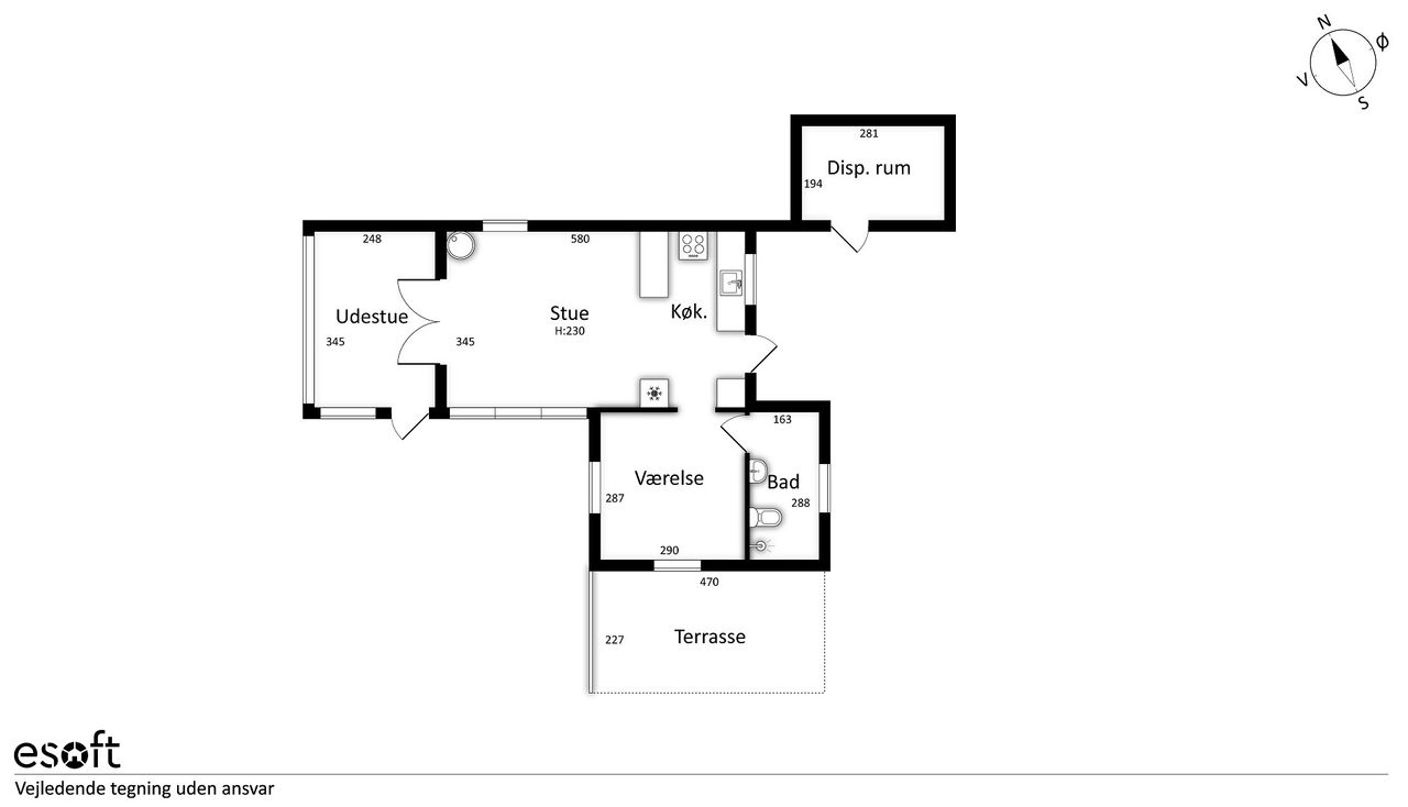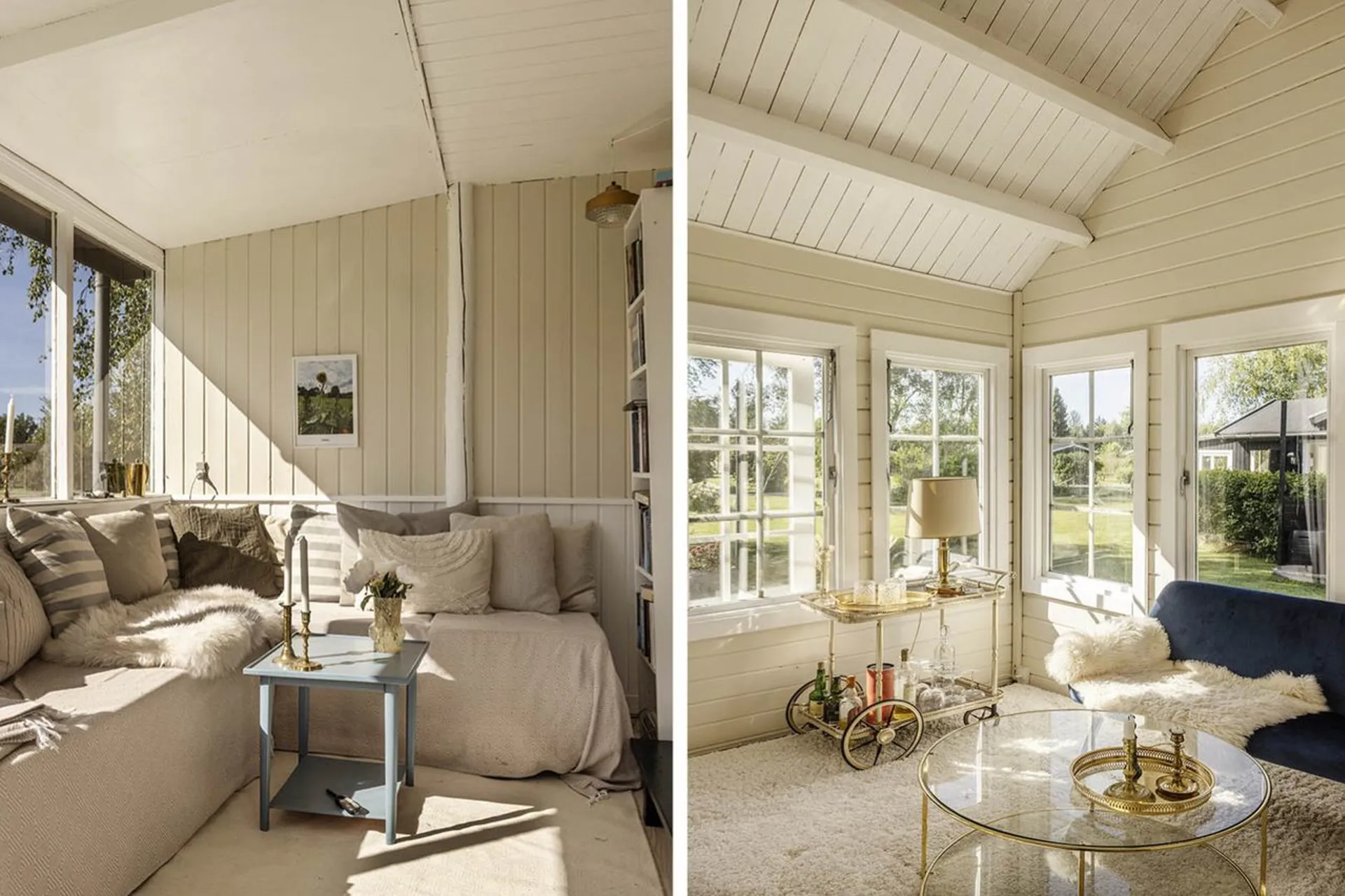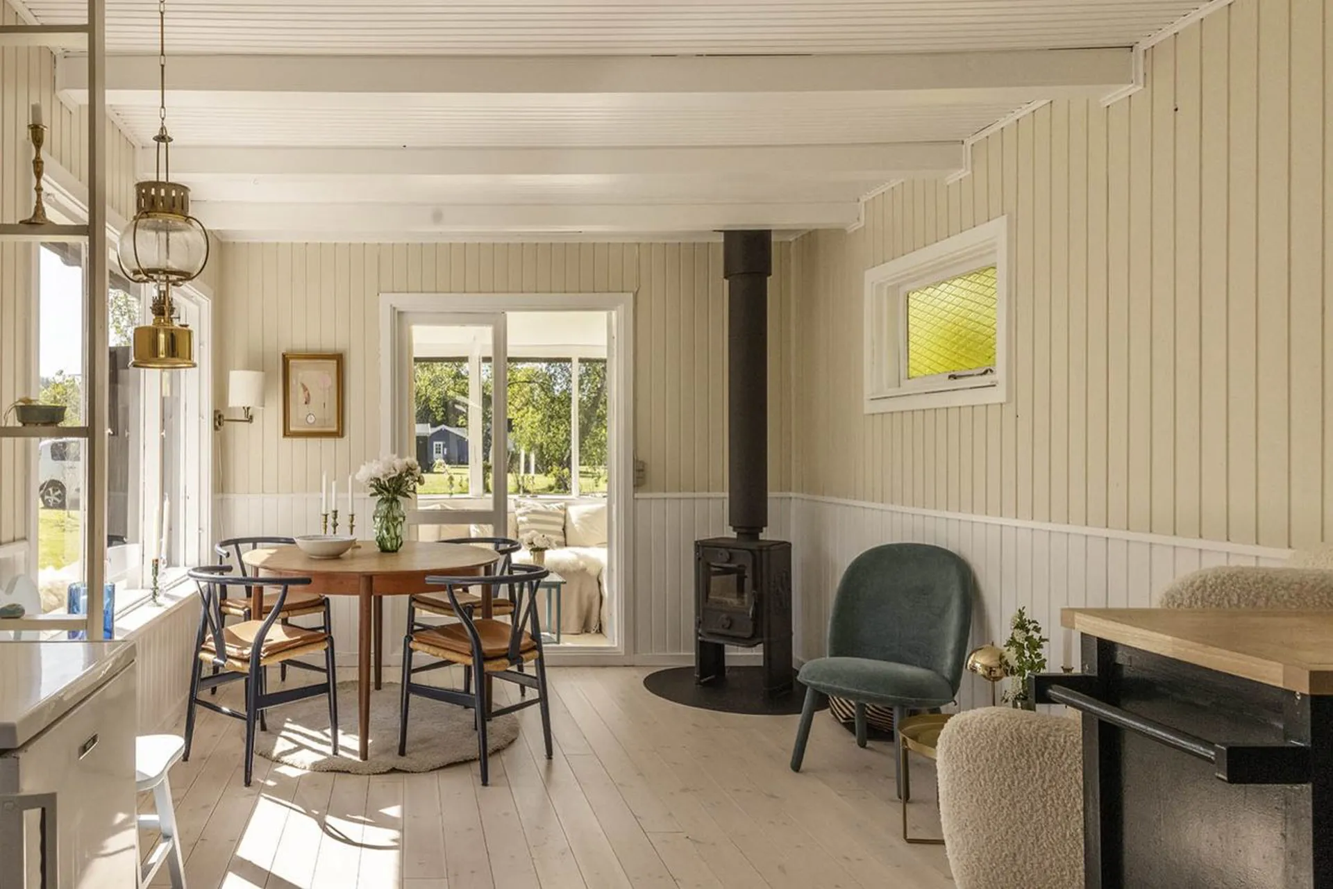 Hovedhuset er indrettet med stort alrum, der fordeler et lille funktionelt indrettet køkken, spisestue og opholdsstue i ét. Her er plankegulve, en Morsø brændeovn, udgang til det omkringliggende terrasseområde og de skønneste lysindfald. En suite hertil er en vidunderlig vinterhave/havestue med kig ud til den omkringliggende syrenhave. Desuden er der et soveværelse og et badeværelse med brus.