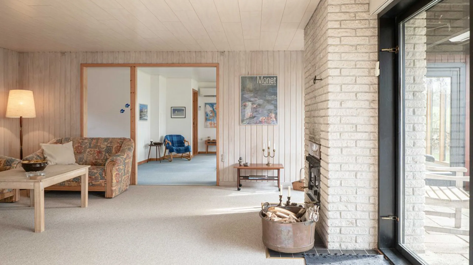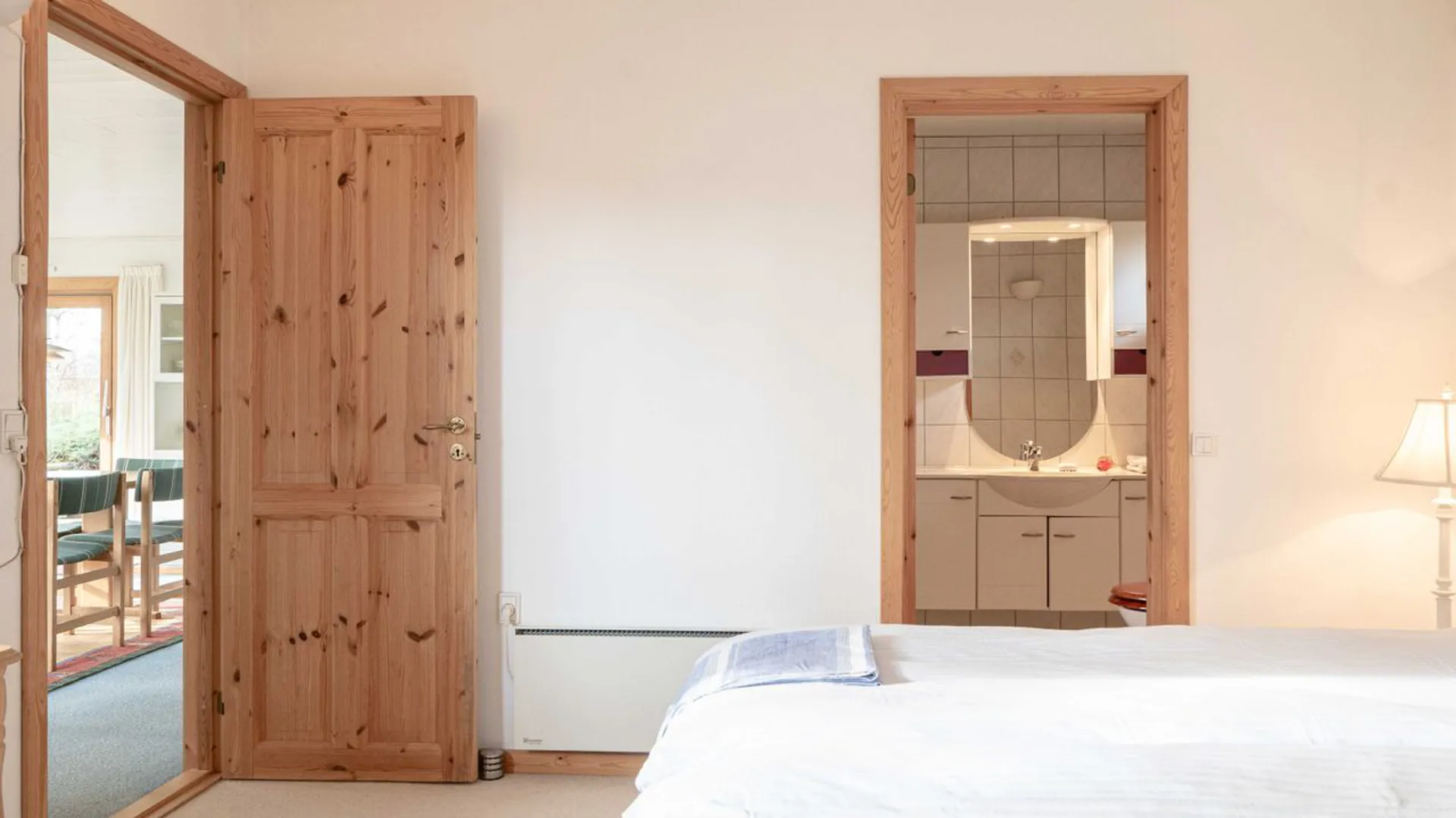 En elegant indbygningspejs forstærker den arkitektoniske helhed og tilfører en varme, der gør huset til et sted for alle årstider. Her er to fine soveværelser med tilhørende badeværelse og en forældreafdeling med eget badeværelse og forbindelse til naturen udenfor.