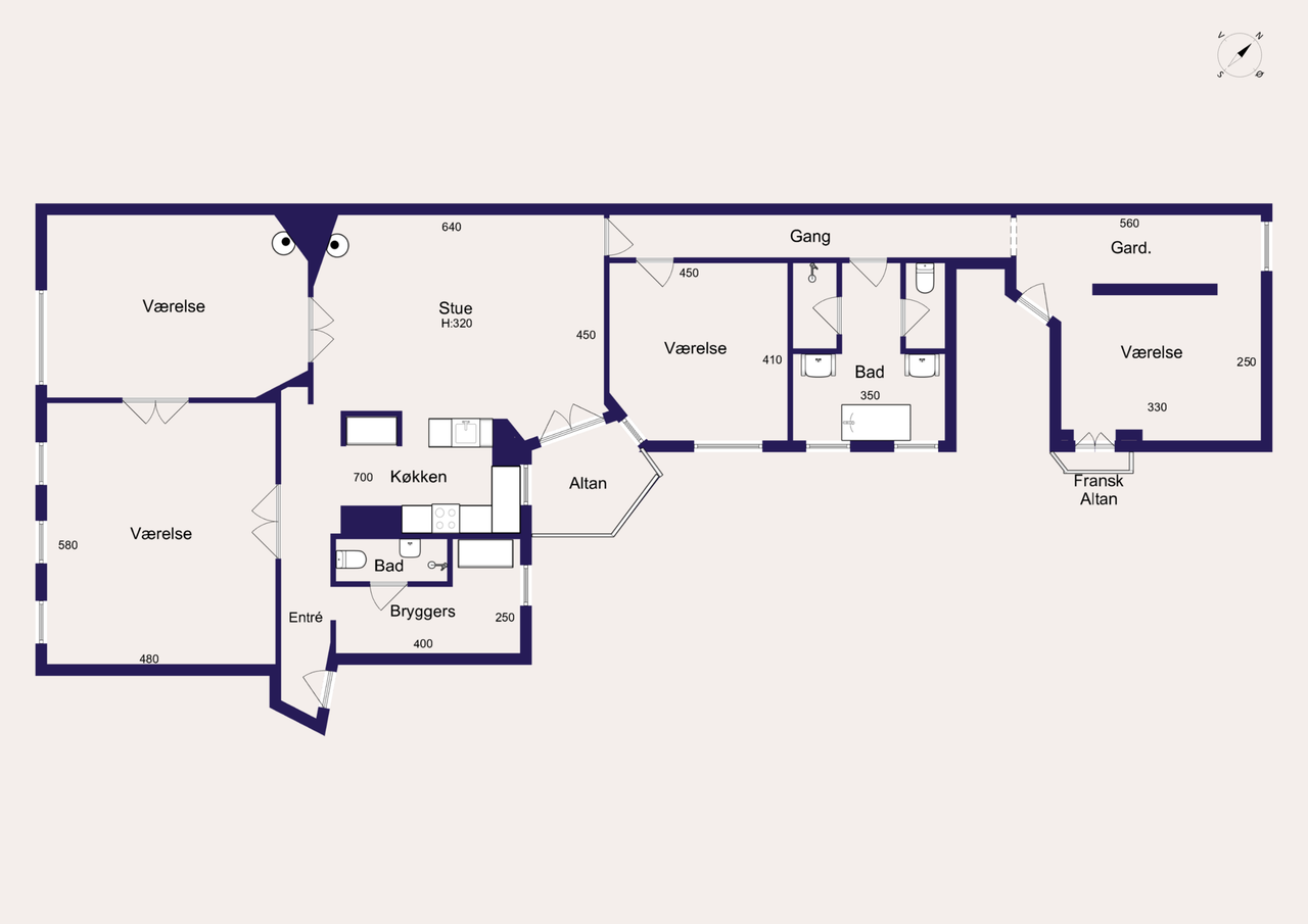 Dette er en ualmindelig ideel og ekstravagant bolig for det meget pladskrævende par og stadig særdeles god for den mindre familie med behov for to soveværelser. Stort alrum, stuer en suite, svenske kakkelovne i stue og alrum, forældreafdeling med skabsvæg, bryggers og plads. Plads til hverdag og plads til fester. Plads til store selskaber og plads til at finde sig til rette i sine små kroge og hjørner. Plads til store armbevægelser, til kunst og til hverdagsaftener i læ af dagens travlhed.