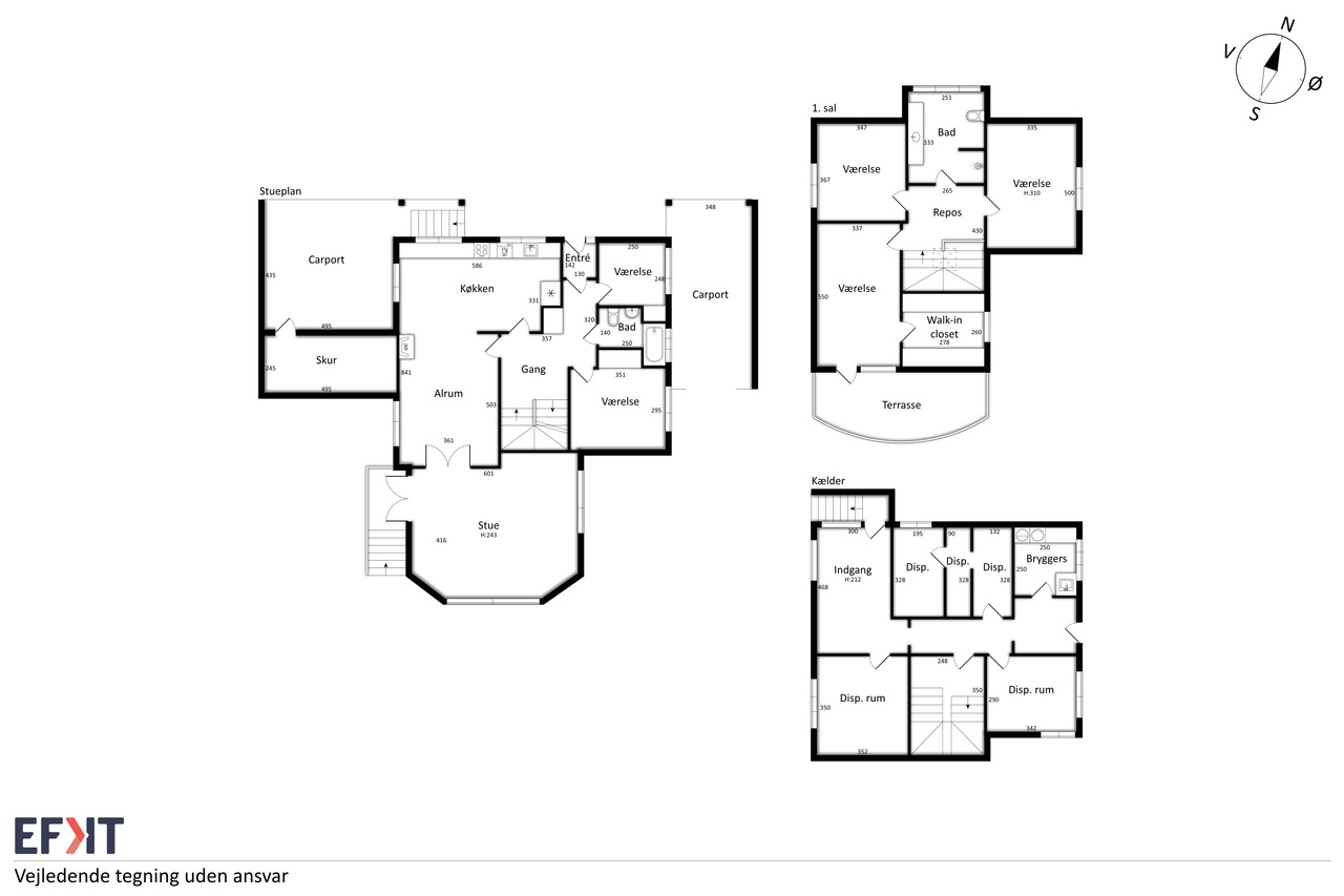 Førstesalen er indrettet med tre store værelser, hvor det tredje værelse er en afdeling for sig selv med walk-in-closet og udgang til den store altan. Herudover badeværelse.