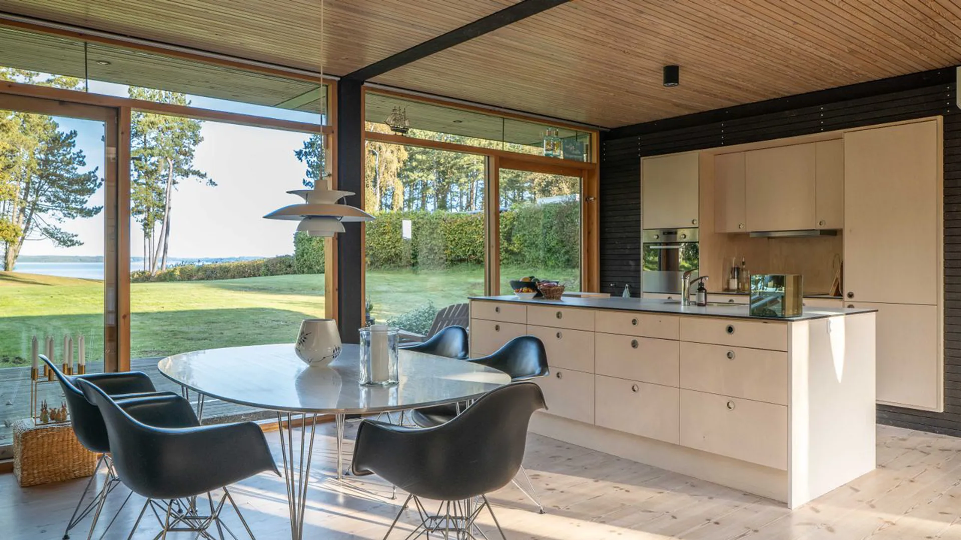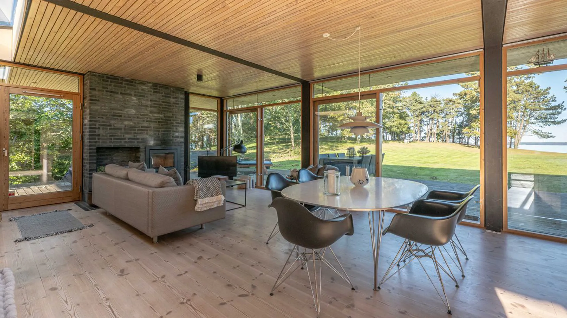 Huset er indrettet med entré til stort alrum, der fordeler funktionelt designet køkken med spisestue, opholdsstue med brændeovn – og til den ene side to velproportioneret soveværelser, og til den anden forældreafdeling med tilknyttet badeværelse. Fra alrummet er der flere udgange til det omkringliggende terrasseområde, der til den ene side er orienteret mod den enkelt anlagte parkagtige have på 2.540 m2 i lige linje mod Kalø Vig, og til den anden åbner op til et overdækket udeområde med pejs og opholdssted, der inviterer til at side i læ hen over de sene aftentimer.